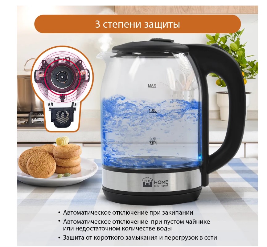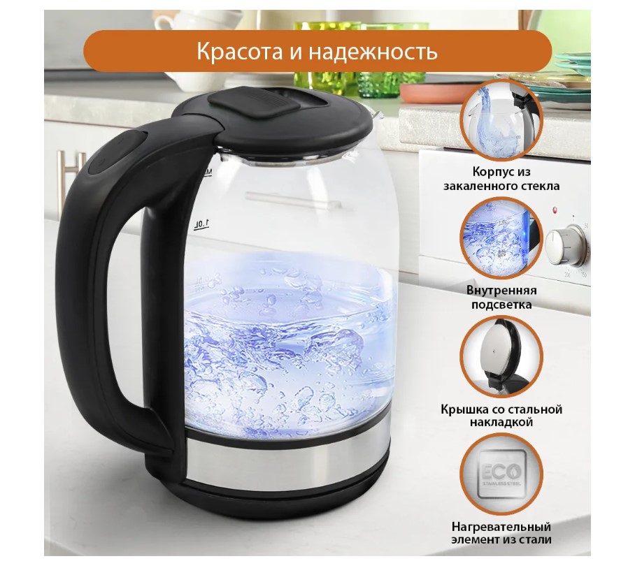 Легкий и прочный стеклянный чайник с голубой внутренней подсветкой в стильном прозрачном корпусе из закаленного стекла. Качественное стекло сохраняет природный вкус и все натуральные свойства воды, не выделяя примесей. Двухлитровый чайник имеет повышенную мощность 1.8 кВт для самого быстрого закипания воды и закрытый нагревательный элемент для противостояния накипи и легкости ухода. Вращение чайника на базе обеспечивает простой доступ к его ручке с любой стороны без опасности обжечься, а многоуровневая система защиты автоматически отключит чайник при готовности кипятка или при недостаточном количестве воды. Светодиодная подсветка дарит прекрасное настроение игрой света в пузырьках закипающей воды.