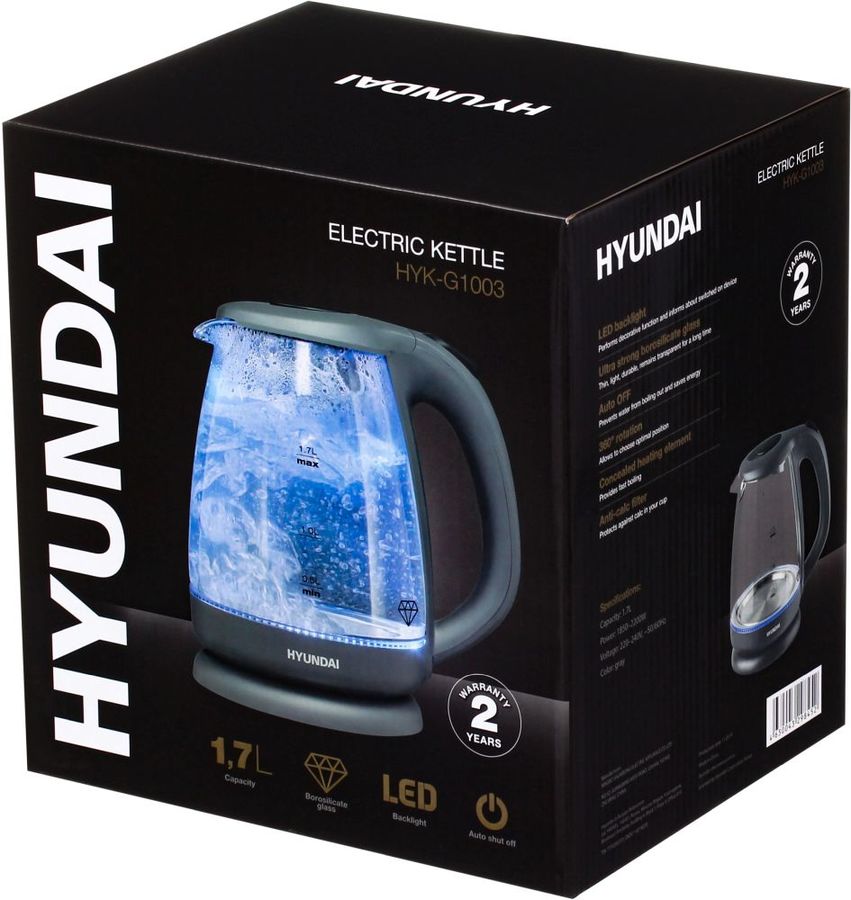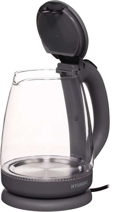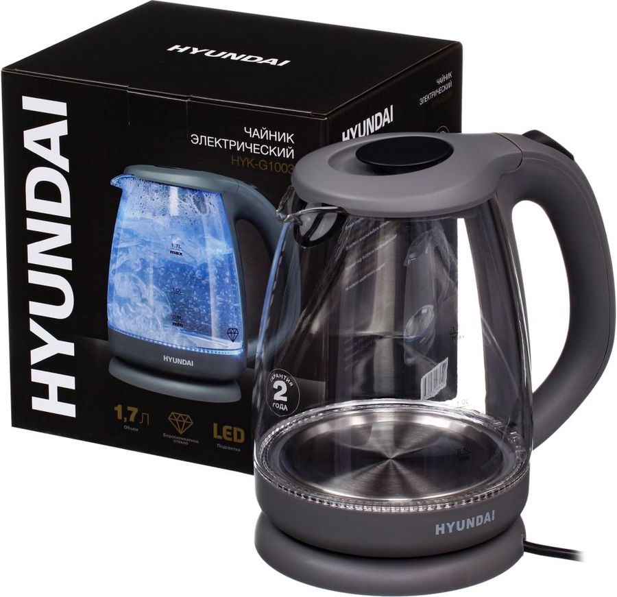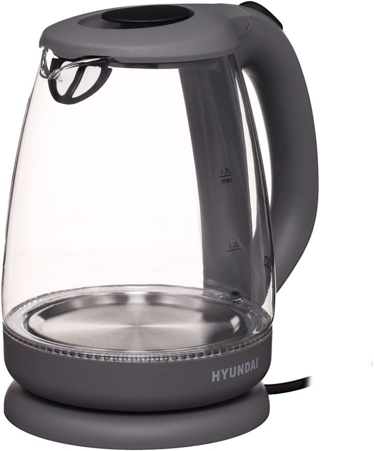 мощность 2200Вт; объем 1.7л; корпус стекло и пластик; фильтр от накипи, подсветка воды; цвет серый