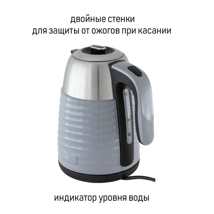 Стильный электрический чайник JVC JK-KE1725 с двойными стенками и защитой от ожогов при касании станет оригинальным украшением Вашей кухни и прекрасным подарком друзьям и родственникам.