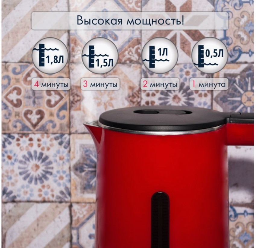 двойные стенки, вращение на 360 градусов, индикатор уровня воды, фильтр, индикация включения