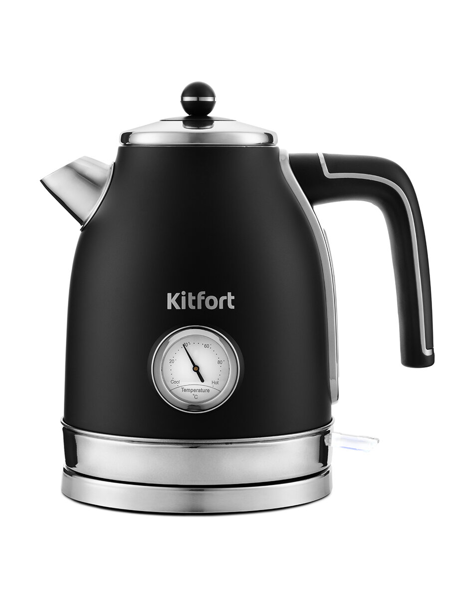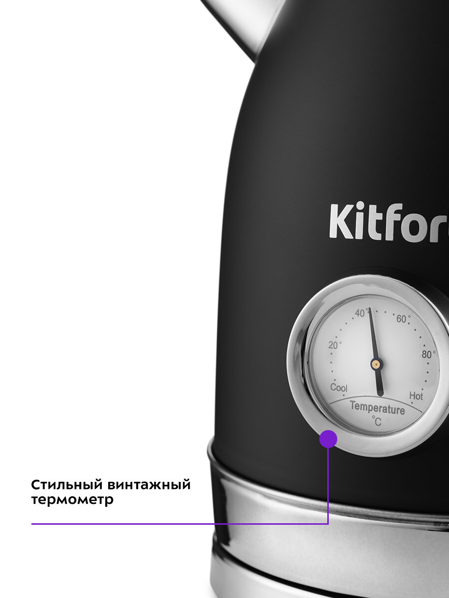 Чайник Kitfort КТ-6102 имеет встроенный термометр, выполненный в винтажном стиле. Это очень удобно для заваривания различных напитков, для которых требуется определённая температура воды. Например, зелёный чай, белый чай, кофе и тд.