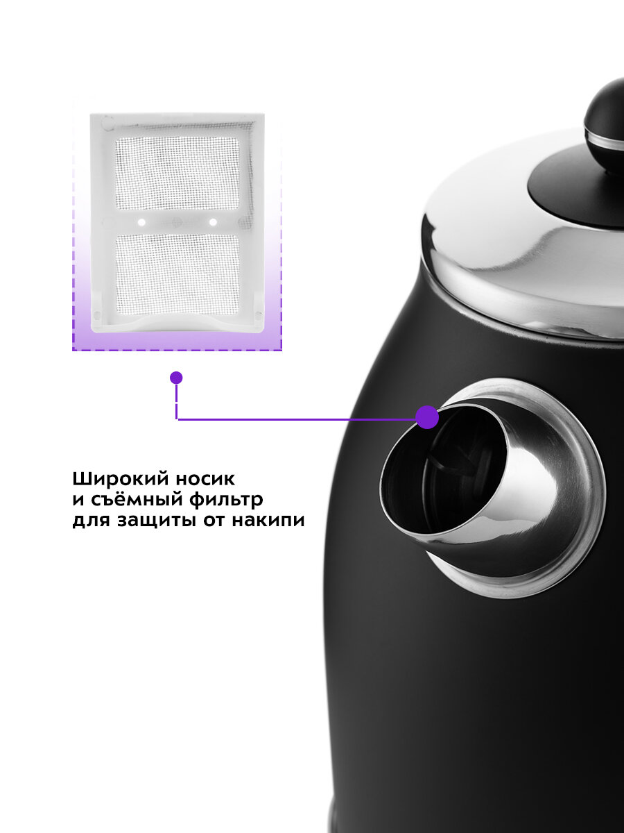 Специальная форма носика позволяет точно наливать воду в чашку без расплёскивания и брызг и быстро наполнять её. В носике чайника расположен съёмный фильтр от накипи, который задерживает частички накипи и предотвращает их попадание в чашку.