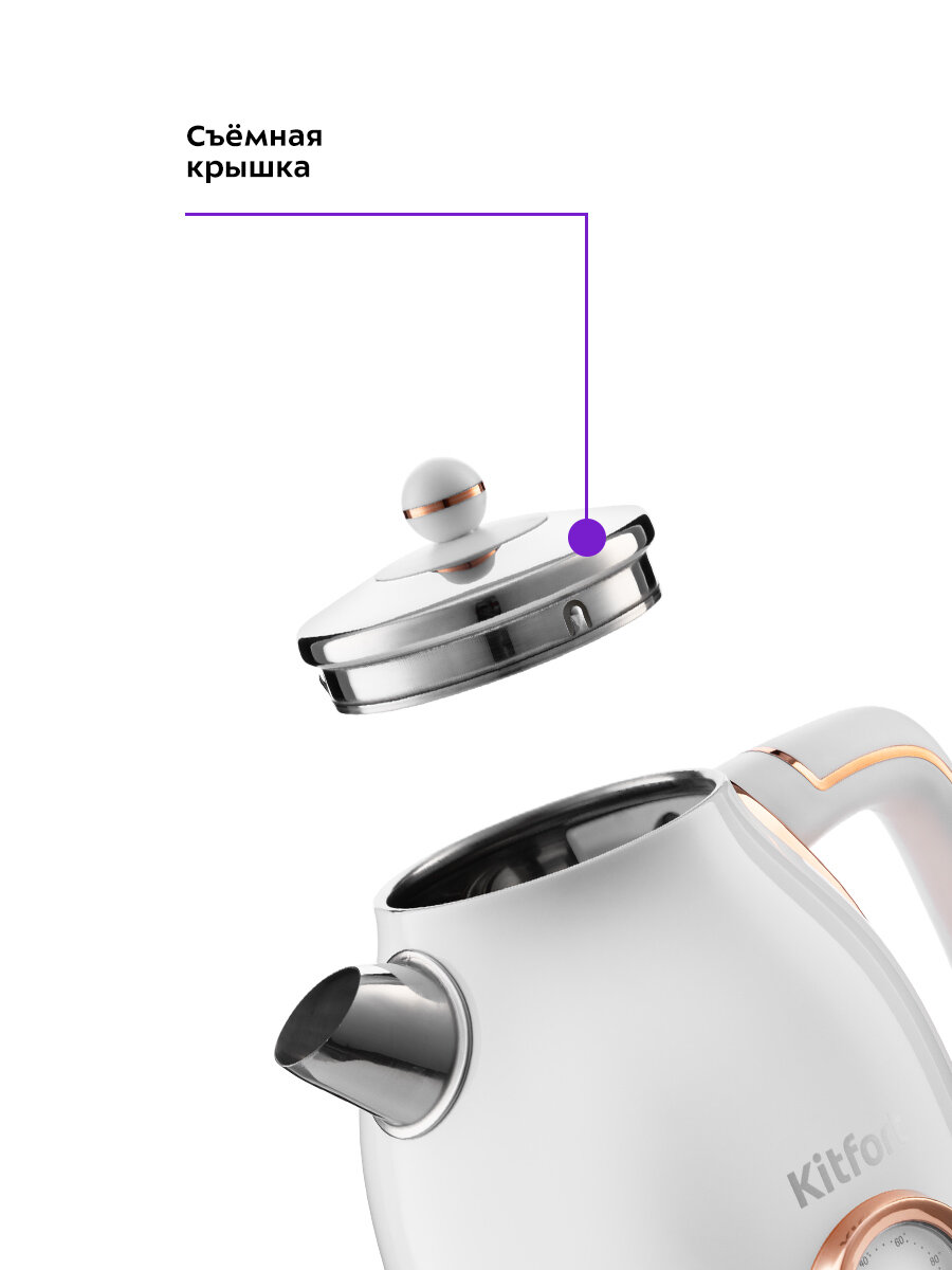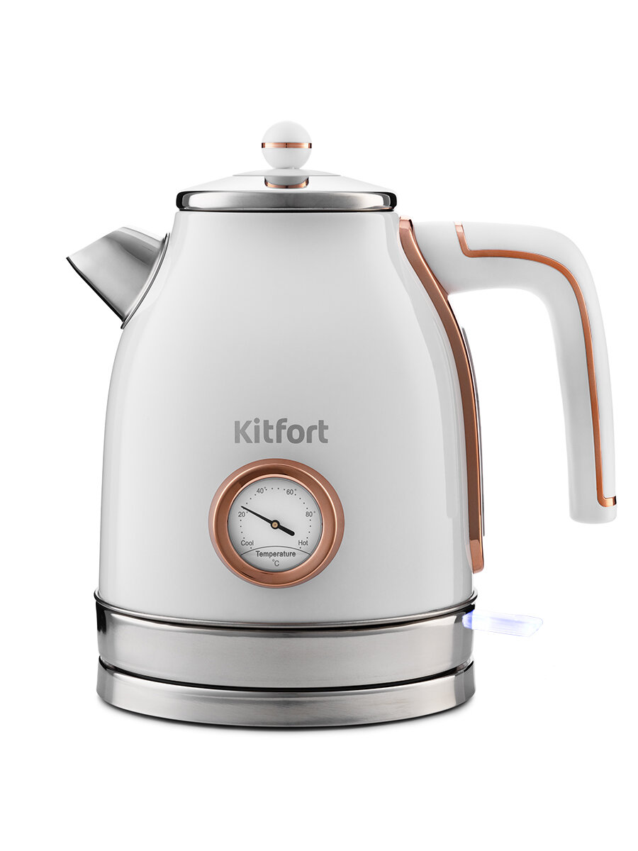 Чайник Kitfort КТ-6102 имеет встроенный термометр, выполненный в винтажном стиле. Это очень удобно для заваривания различных напитков, для которых требуется определённая температура воды. Например, зелёный чай, белый чай, кофе и тд.
