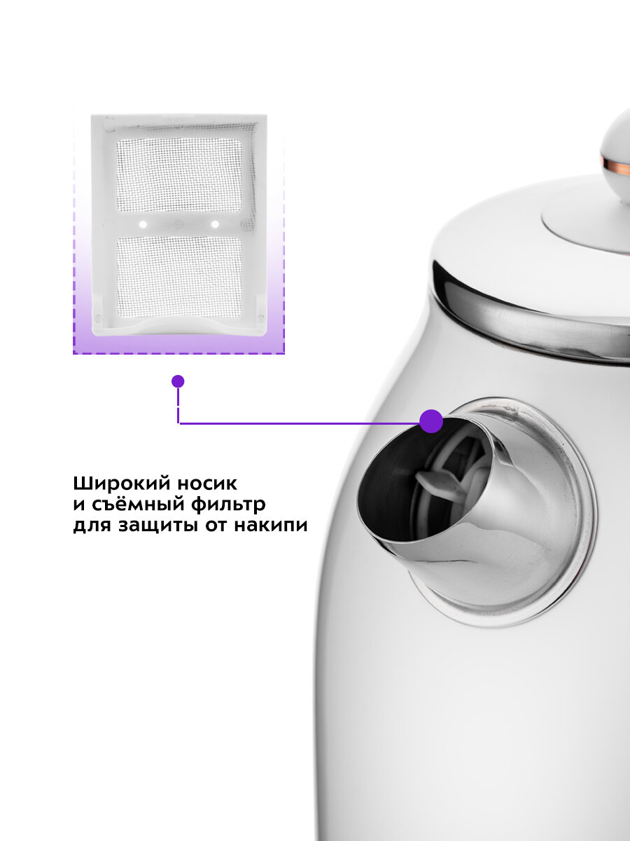 Специальная форма носика позволяет точно наливать воду в чашку без расплёскивания и брызг и быстро наполнять её. В носике чайника расположен съёмный фильтр от накипи, который задерживает частички накипи и предотвращает их попадание в чашку.