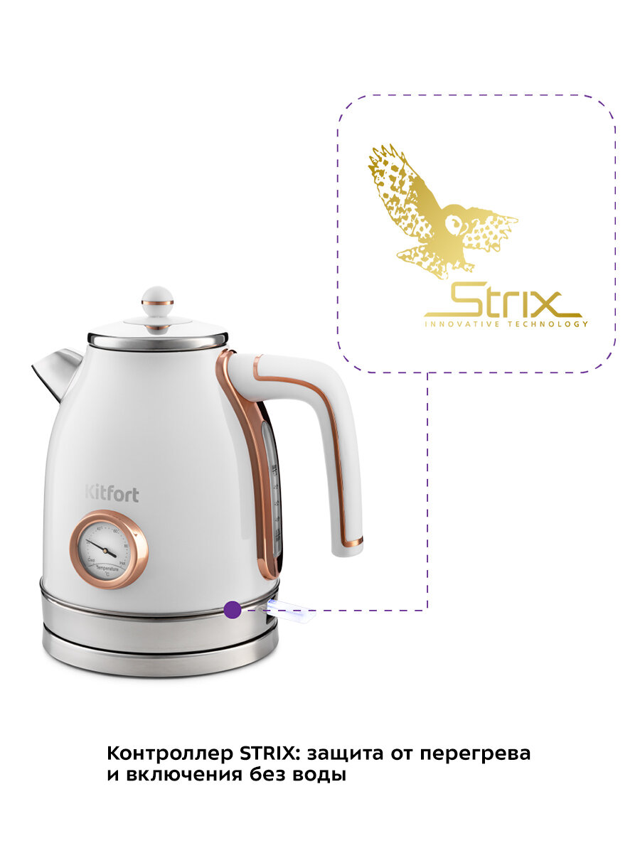 Чайник оснащён контроллером Strix - № 1 среди поставщиков компонентов для электрочайников. Он устраняет риски короткого замыкания и возгорания прибора. Обеспечивает защиту при закипании, при включении чайника без воды.