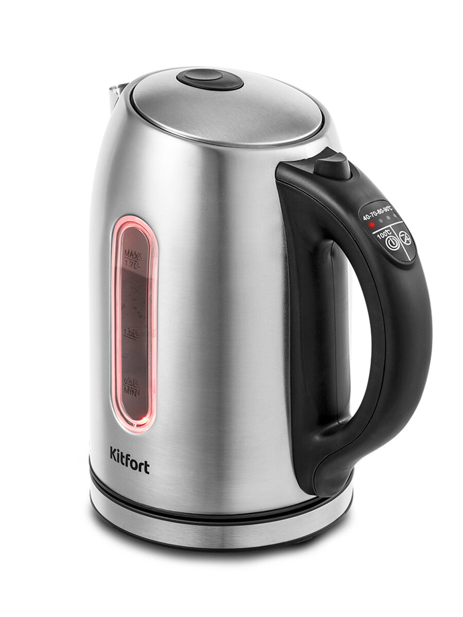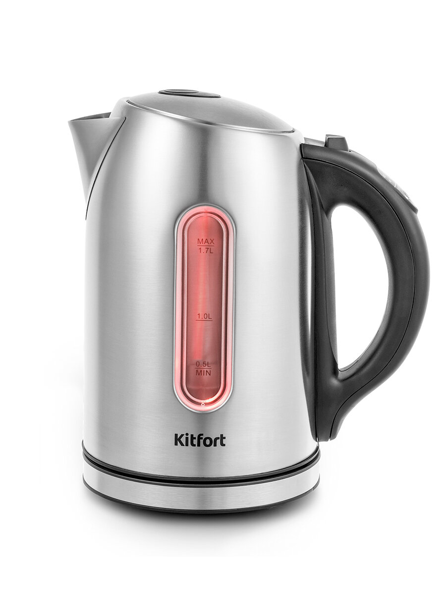Чайник Kitfort КТ-6106 выполнен в стильном металлическом корпусе. Ручка чайника пластиковая, не нагревается и удобно лежит в руке. Для вашего удобства на ручке расположена панель управления чайником.