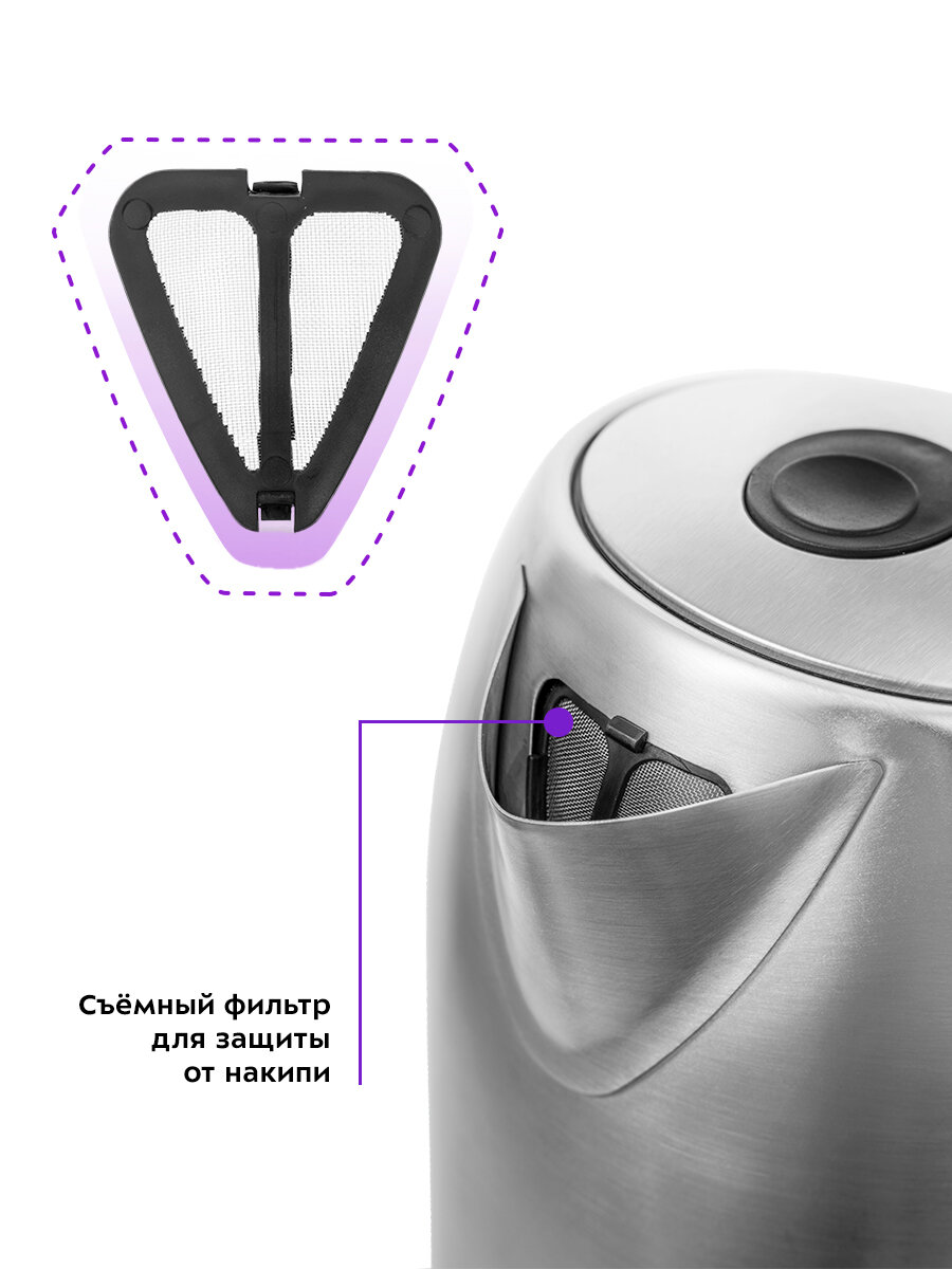 В носике чайника расположен съёмный фильтр, который задерживает частички накипи и предотвращает их попадание в чашку.