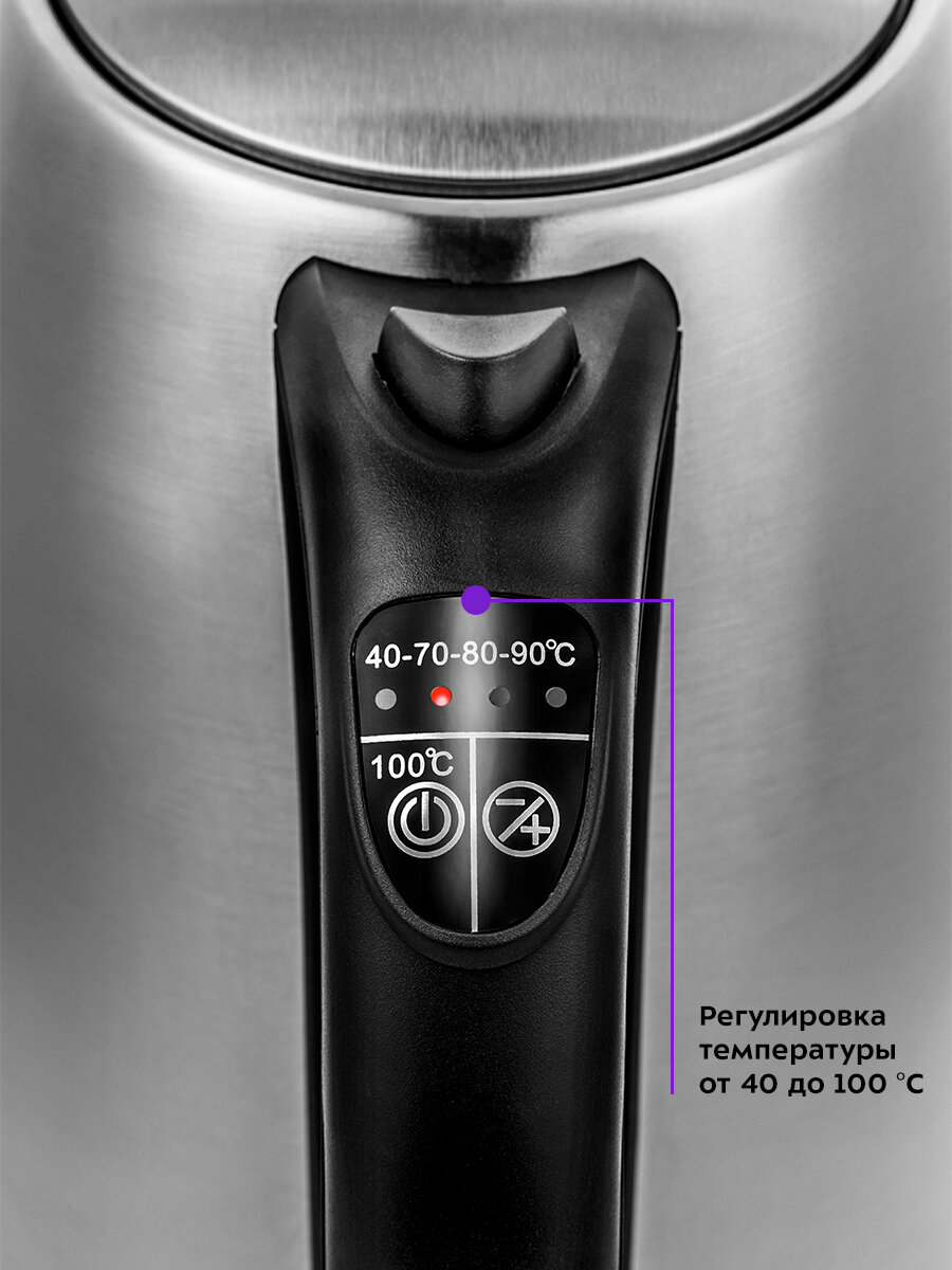 Чайник оснащён терморегулятором и может нагреть воду от 40 до 100 °С, что очень удобно при заваривании различных сортов чая, приготовлении кофе и подогрева детского питания. Чайник также оснащён функцией поддержания температуры до 2 часов.