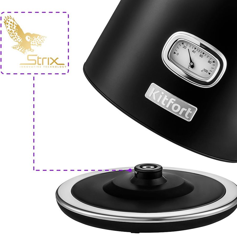 Электрический чайник Kitfort КТ-6150 предназначен для кипячения воды дома, в офисе, на даче. Корпус чайника металлический. Крышка выполнена из металла с пластиковой вставкой, а подставка из пластика. Мерная шкала находится под ручкой. Ручка чайника пластиковая, не нагревается и удобно лежит в руке.