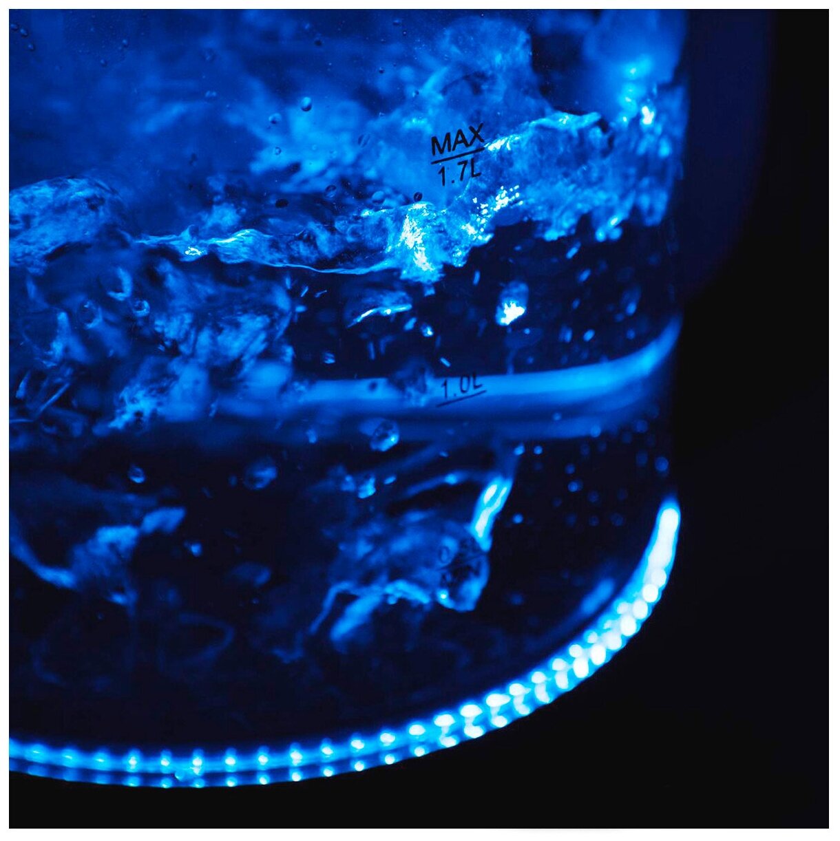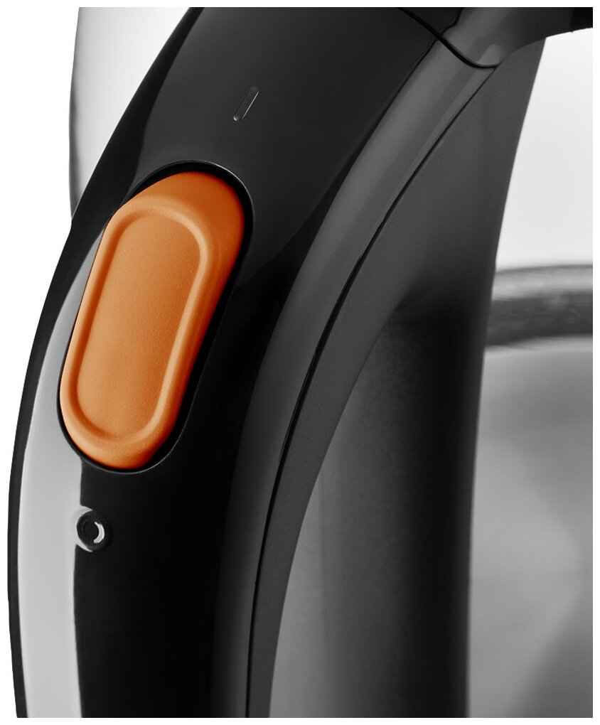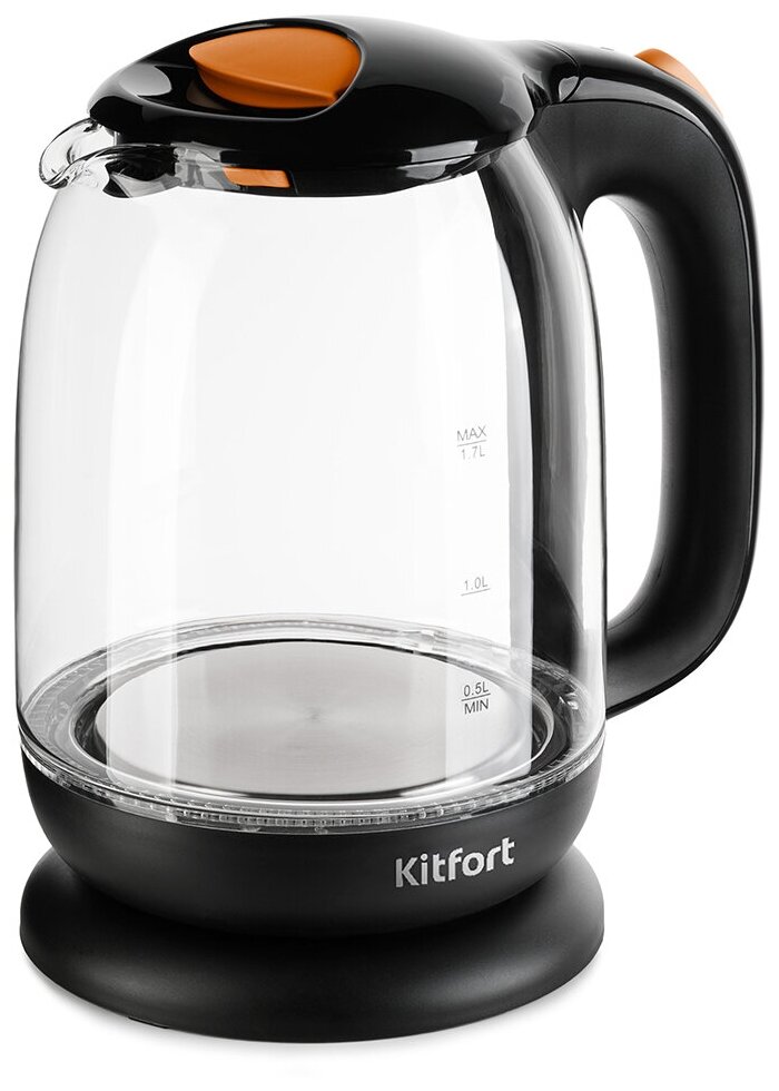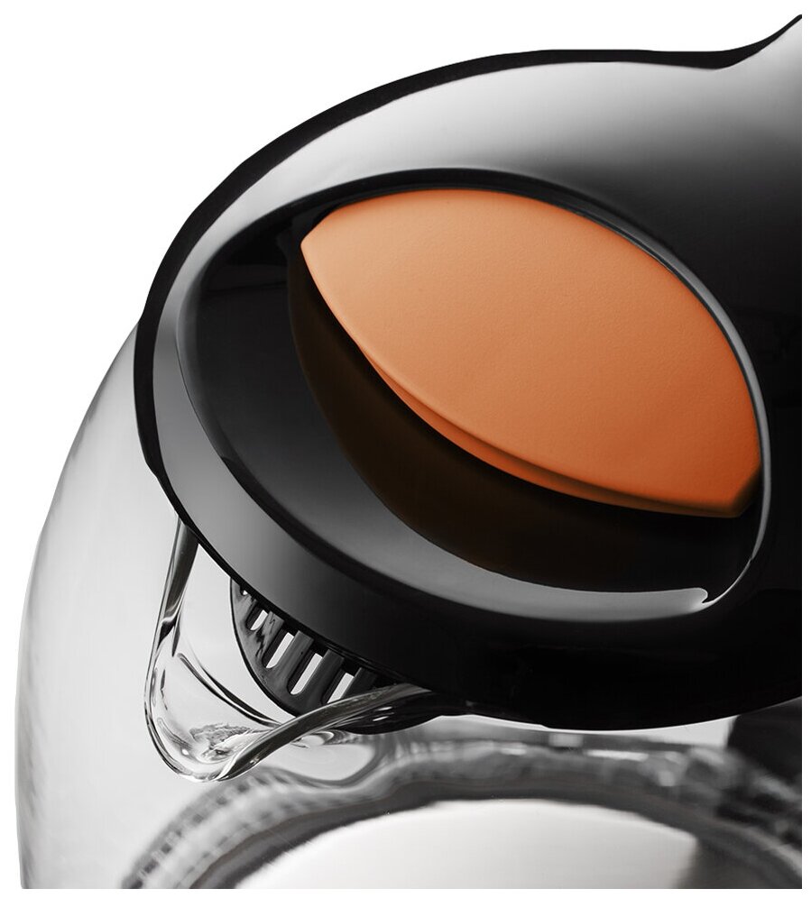 Корпус чайника выполнен из стекла, а крышка и подставка — из пластмассы. Мерная шкала нанесена на прозрачную часть корпуса. Подставка с центральным контактом дает возможность располагать на ней чай ник в любом положении, обеспечивая вращение на 360°.