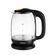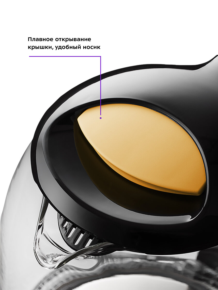 Корпус чайника выполнен из стекла, а крышка и подставка — из пластмассы. Мерная шкала нанесена на прозрачную часть корпуса. Подставка с центральным контактом дает возможность располагать на ней чай ник в любом положении, обеспечивая вращение на 360°.