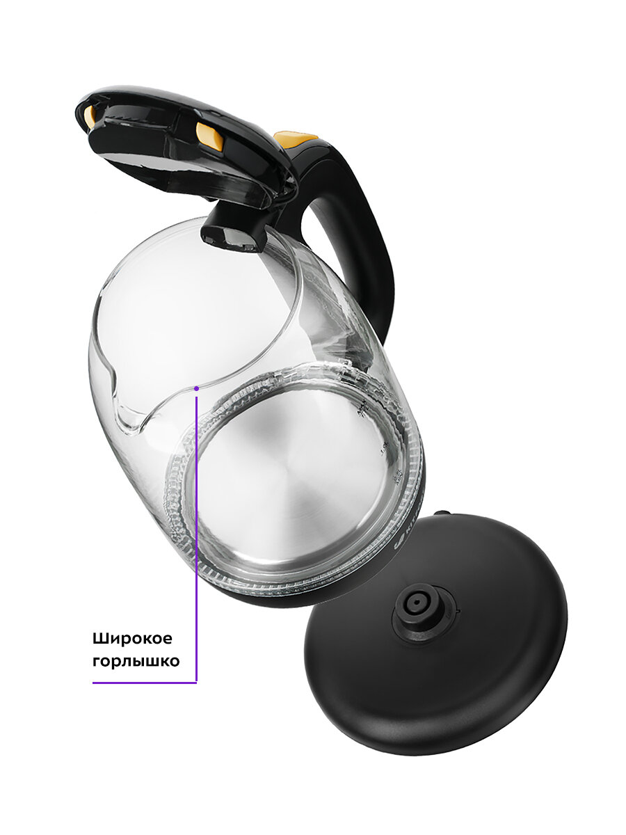 Чайник имеет большое горлышко, что облегчает доступ внутрь при мытье, а также съёмный фильтр-сетку для защиты от накипи.