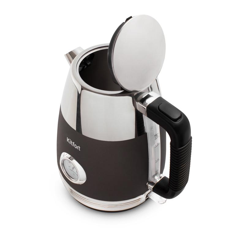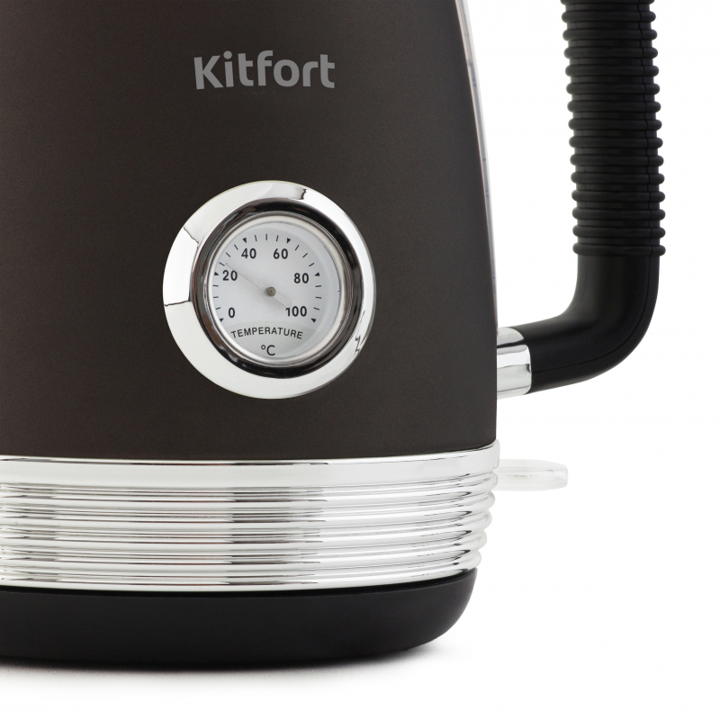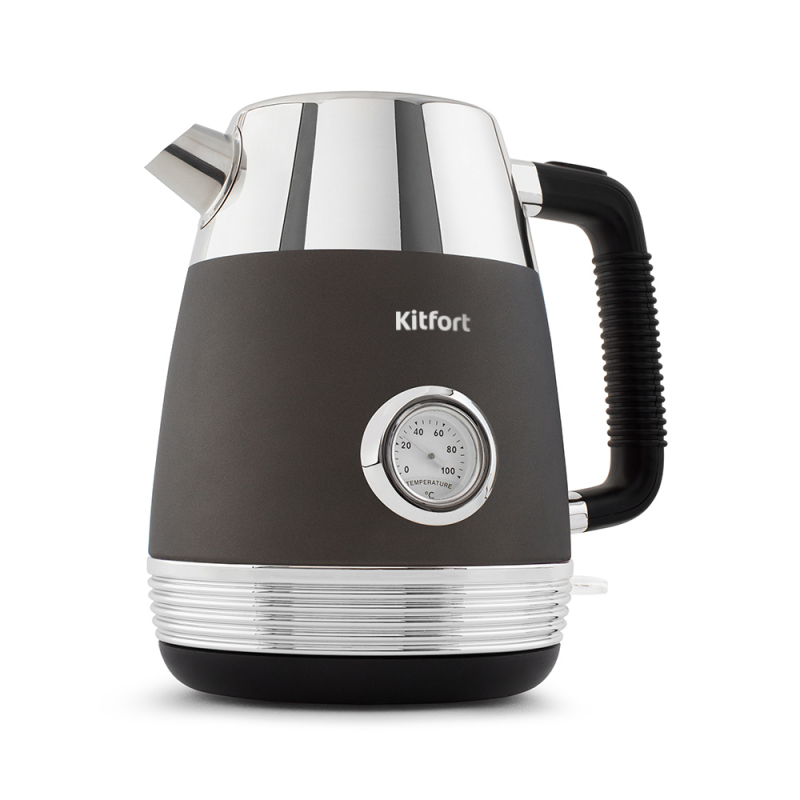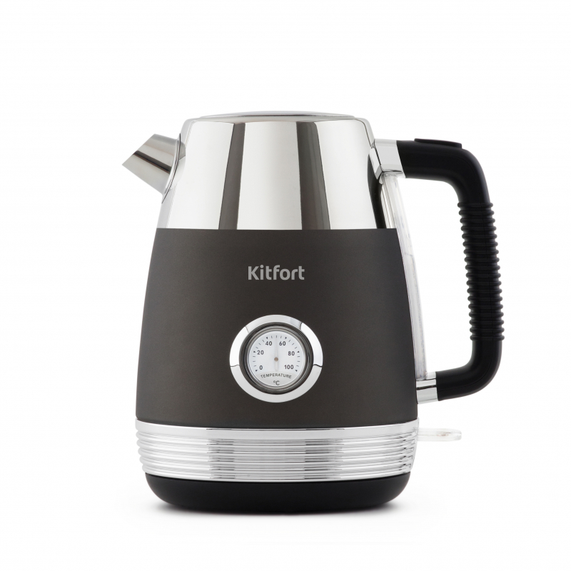 Электрочайник Kitfort КТ-633-1 дополнен винтажным термометром, показывающим актуальную температуру воды. Быстрое кипячение достигается за счет скрытого нагревательного элемента 2150 Вт. Объем — 1,7 л.
