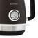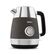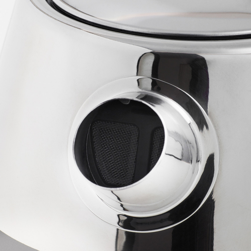 Корпус цвета «графит» с широко открывающейся крышкой изготовлен из нержавеющей стали. Мерная шкала, помогающая контролировать уровень воды, находится под ручкой. Накипь не попадет в чашки, потому что в носике размещен фильтр. Прибор прекращает работу автоматически, когда закипает, если его снять с подставки, а также при пустом резервуаре. Размеры — 22,5х22х16,5 см, вес — 1 кг.