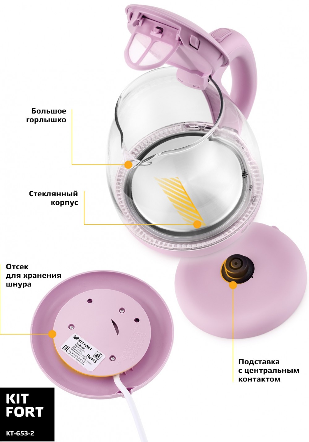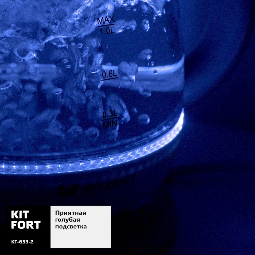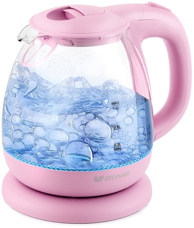 чайник, объём: 1-1 л, мощность: 1100-1100 Вт, закрытая спираль, индикация включения, материал корпуса: пластик/стекло, подсветка воды при работе
