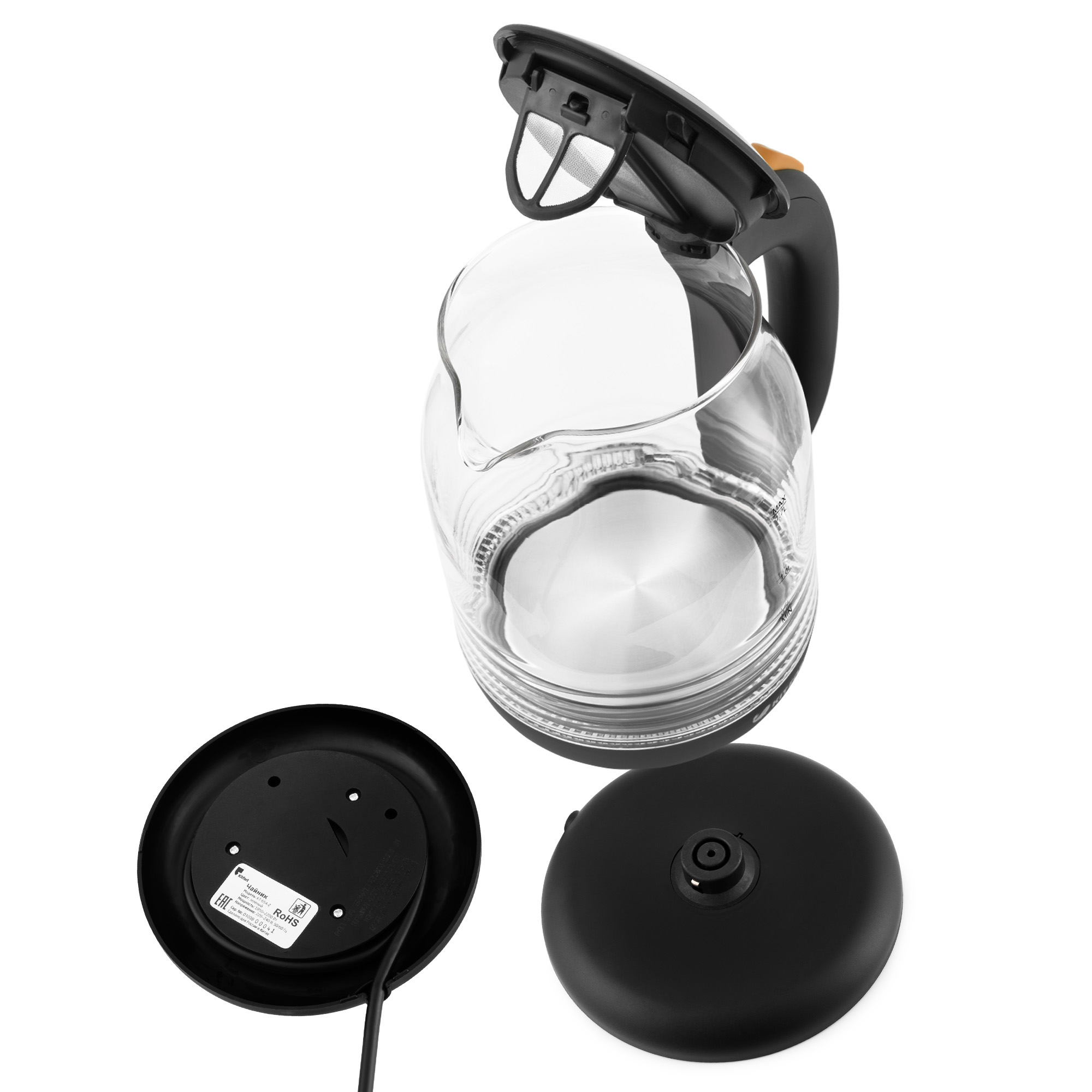 Объём прибора – 1,7 литра, этого хватит, чтобы приготовить напитки и домочадцам, и друзьям, пришедшим в гости. Благодаря встроенному в носик съёмному нейлоновому фильтру хлопья накипи не попадут в ваши чашки. Резервуар для воды выполнен из прочного закалённого стекла, нагревательный элемент скрыт. Такое исполнение существенно упрощает уход за устройством: гладкие стенки легко вымыть, известковые отложения легче «отойдут» от плоского диска, чем от спирали.