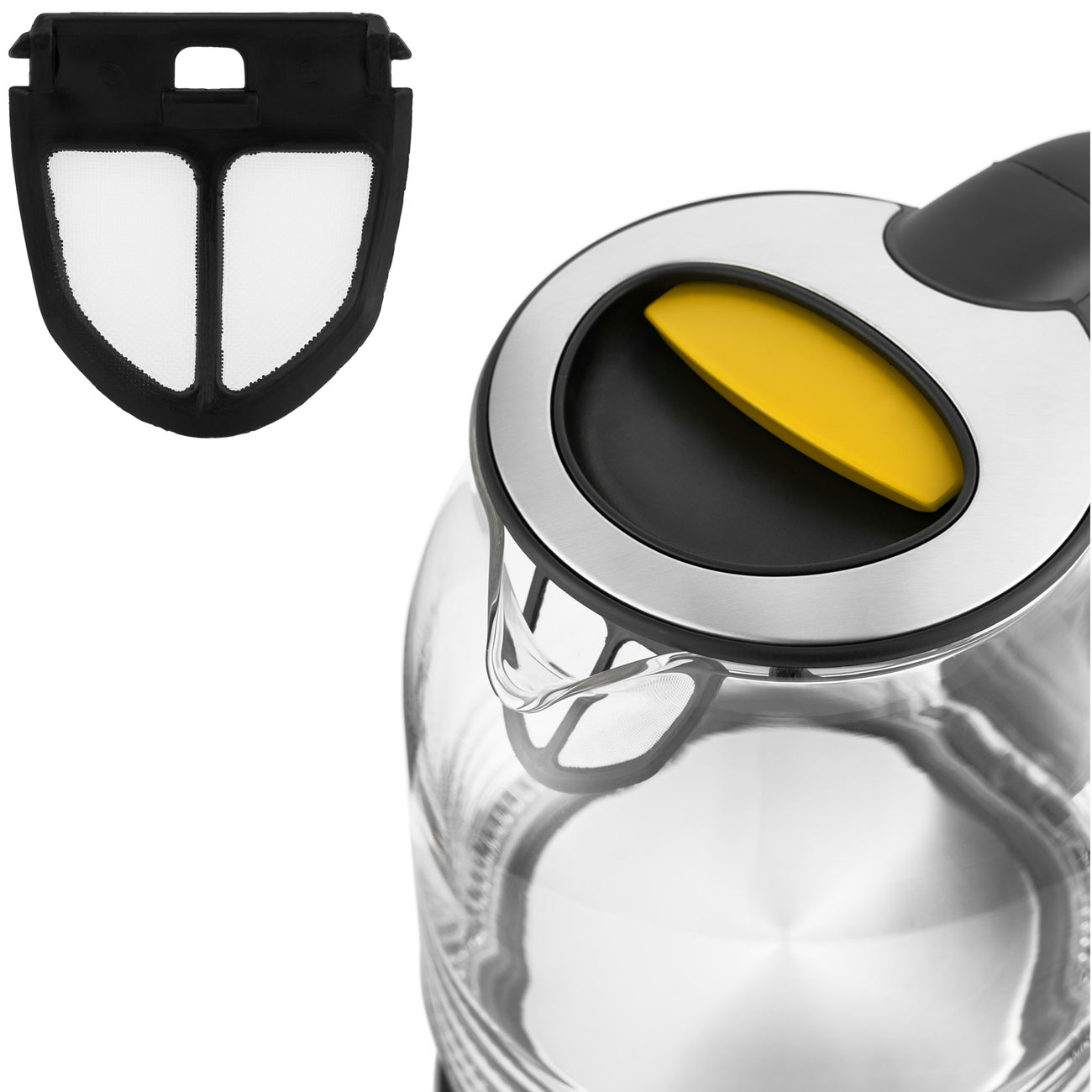 Объём прибора – 1,7 литра, этого хватит, чтобы приготовить напитки и домочадцам, и друзьям, пришедшим в гости. Благодаря встроенному в носик съёмному нейлоновому фильтру хлопья накипи не попадут в ваши чашки. Резервуар для воды выполнен из прочного закалённого стекла, нагревательный элемент скрыт. Такое исполнение существенно упрощает уход за устройством: гладкие стенки легко вымыть, известковые отложения легче «отойдут» от плоского диска, чем от спирали.