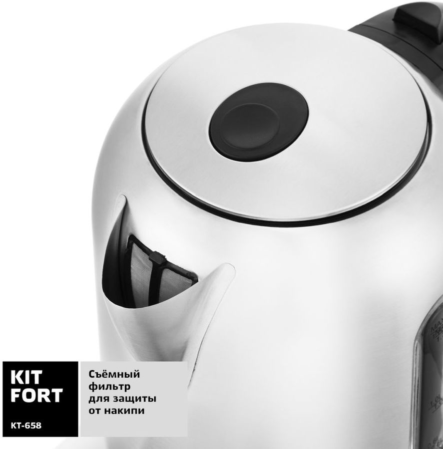 Прочный корпус из нержавеющей стали гарантирует долговечность устройства. За счет скрытого нагревательного элемента и съемного фильтра от накипи обеспечивается защита от образования известкового налета. Электрический чайник KITFORT КТ-658 оснащен не только функцией автоматического отключения при закипании, но и оповещающим звуковым сигналом.