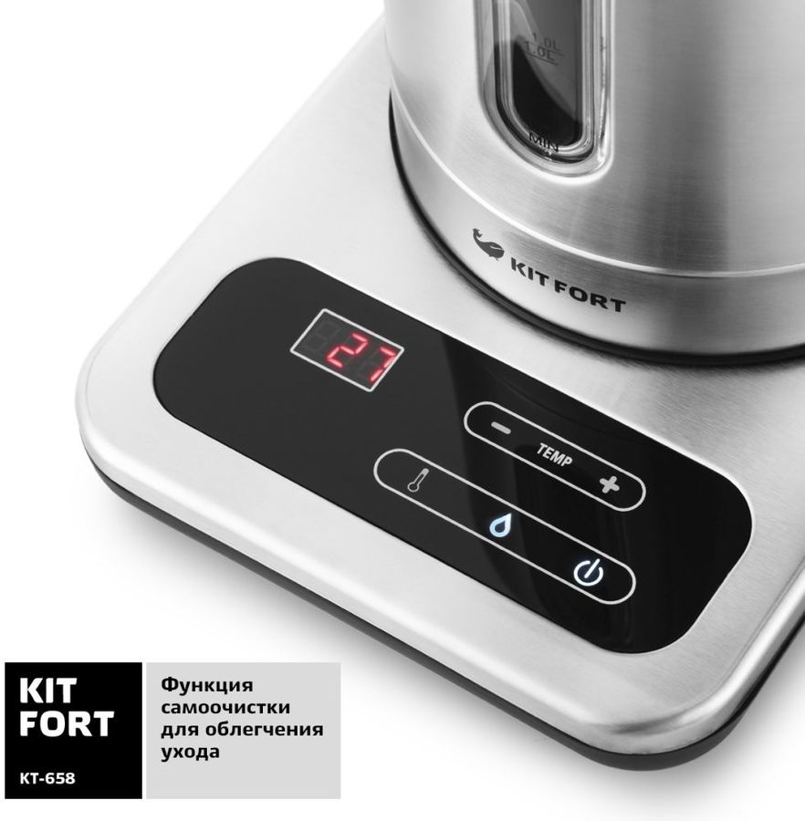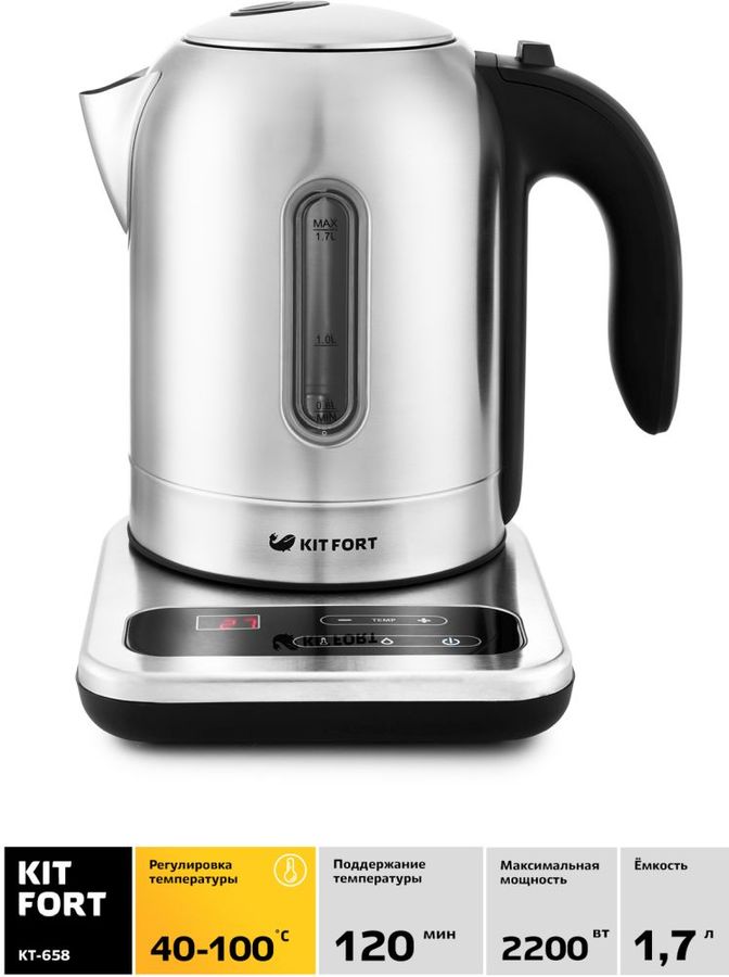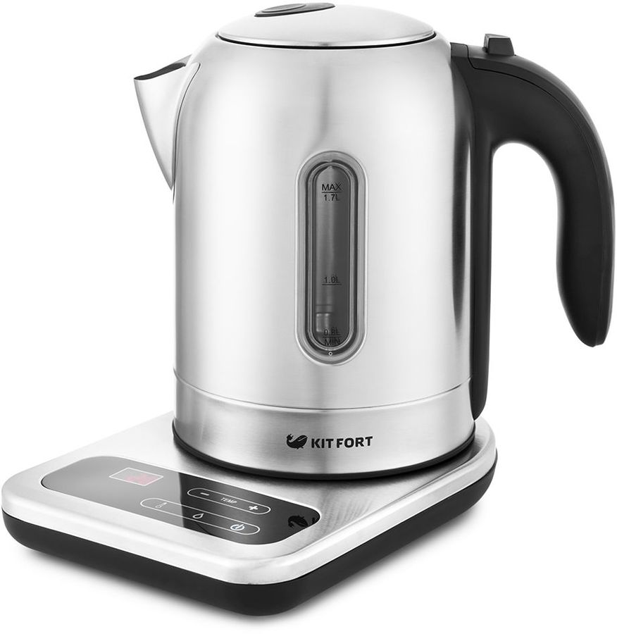 Идеальным устройством не только для кипячения, но и для подогрева воды до определенной температуры является электрический чайник KITFORT КТ-658. Эта модель способна нагреть воду до температуры 40-100 градусов с шагом в 10 градусов, а также поддерживать выбранный показатель в течение двух часов. Эта функция позволяет заваривать различные сорта чая, кофе, а также готовить детское питание. Дисплей, кнопки управления и регулировки температуры нагрева, расположенные на подставке, обеспечивают комфорт и удобство использования.