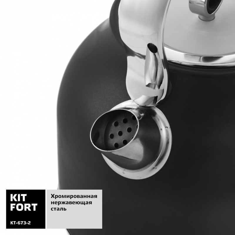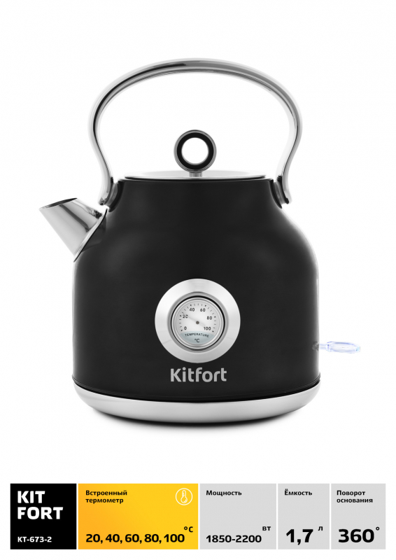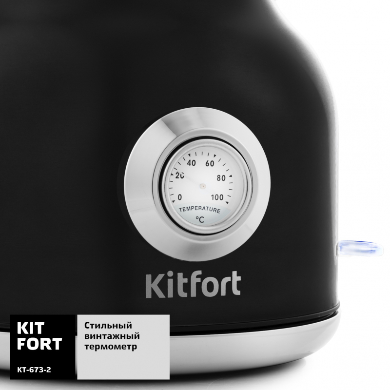 Электрический чайник Kitfort КТ-673-2 предназначен для кипячения воды дома, в офисах и загородных домах. Главная особенность модели – наличие термометра на боковой поверхности корпуса, благодаря которому можно точно оценить температуру воды для приготовления того или иного напитка. Ручка чайника изготовлена из пластика, а корпус – из нержавеющей стали. Ручка не нагревается и удобно лежит в руке. Кнопка включения/выключения расположена на корпусе снизу, на противоположной стороне от носика чайника. Чайник укомплектован крышкой с удобной ручкой. Подставка выполнена из пластика. Нагревательный элемент (ТЭН) у данной модели чайника скрытый и находится в донной части. Сверху он закрыт специальной металлической пластиной из нержавеющей стали, благодаря которой исключается прямой контакт ТЭНа с водой и обеспечивается повышенный срок его службы. Такая конструкция также препятствует образованию накипи, облегчает уход и значительно снижает шум при нагревании воды. Подставка с центральным контактом дает возможность располагать на ней чайник в любом положении, обеспечивая вращение на 360°. Есть отсек для хранения шнура. Чайник автоматически отключается при закипании и при снятии с подставки, имеет защиту от перегрева и от включения без воды.