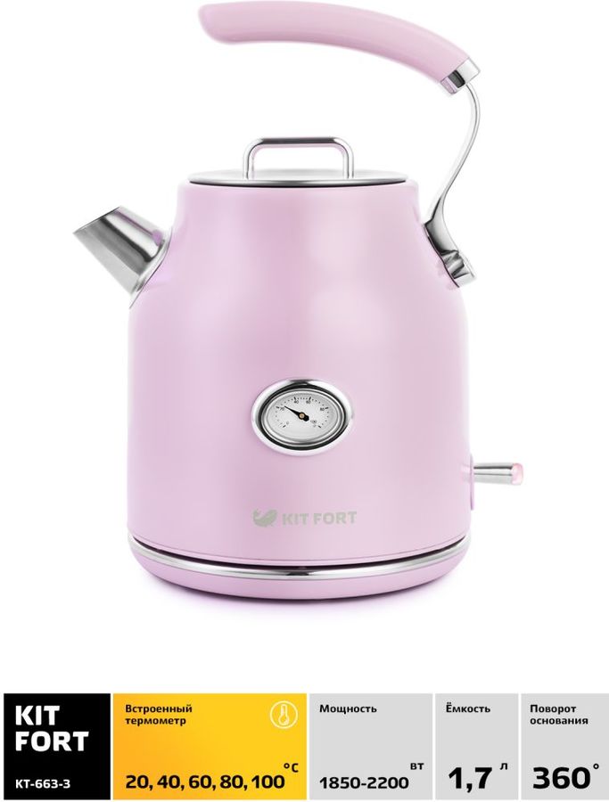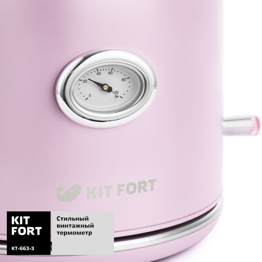Среди ключевых особенностей электрического чайника KITFORT КТ-663-3 можно отметить наличие стильного винтажного термометра. Он не только украшает рассматриваемый прибор, но и обладает функциональным значением и позволяет понять, какова сейчас температура находящейся внутри воды. Есть удобная подставка на 360 градусов. Чайник автоматически отключается, когда вода достигает заданной температуры.