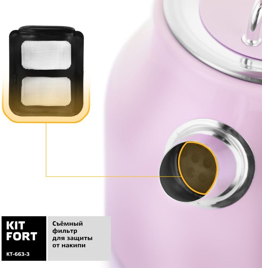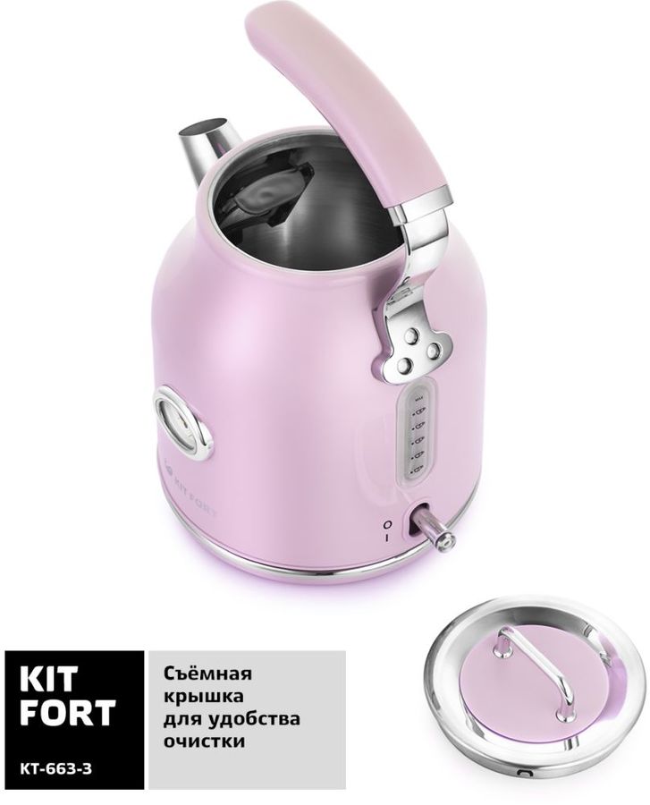 Выполненный в Китае электрический чайник KITFORT КТ-663-3 имеет гарантийный срок продолжительностью в двенадцать месяцев. Он непременно понравится представительницам прекрасной половины человечества, поскольку выполнен в симпатичным интересном розовом оттенке. Такая модель способна украсить собой любую кухню. Она выполнена из металла, что позволяет не сомневаться в долговечности и надежности.