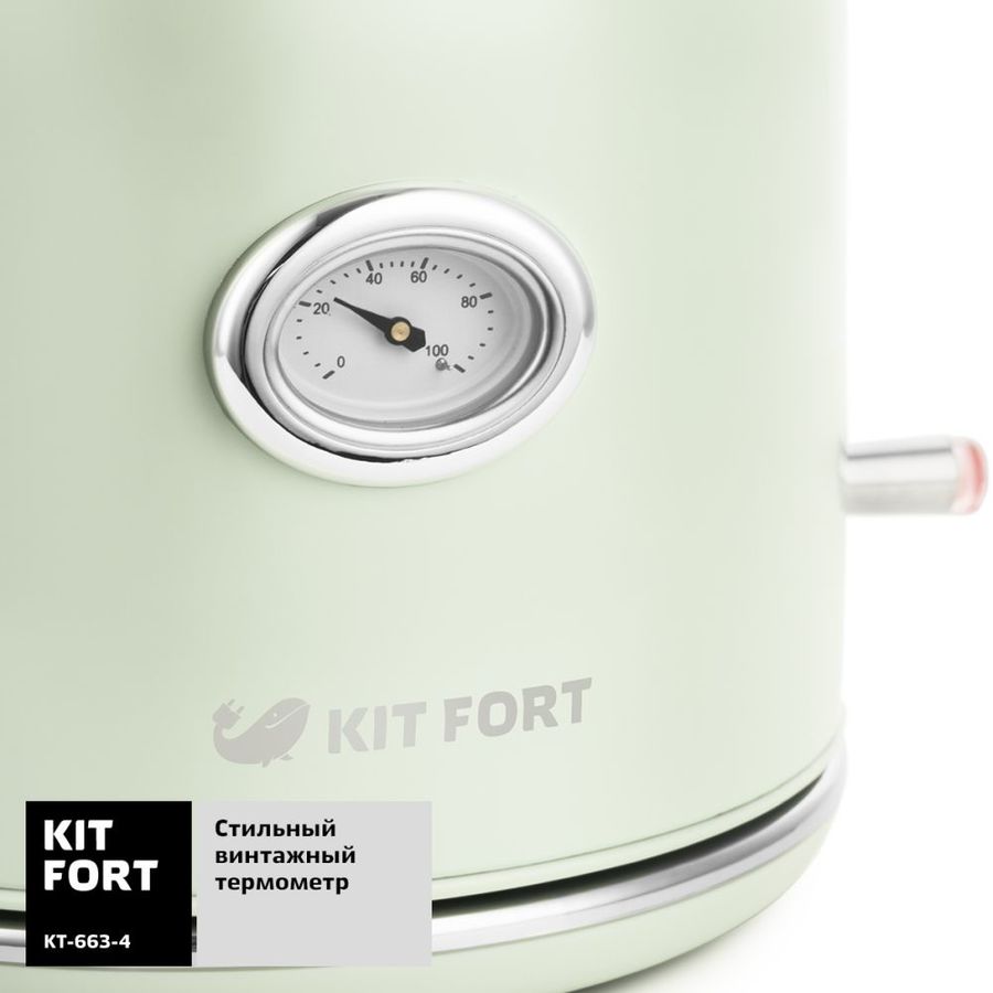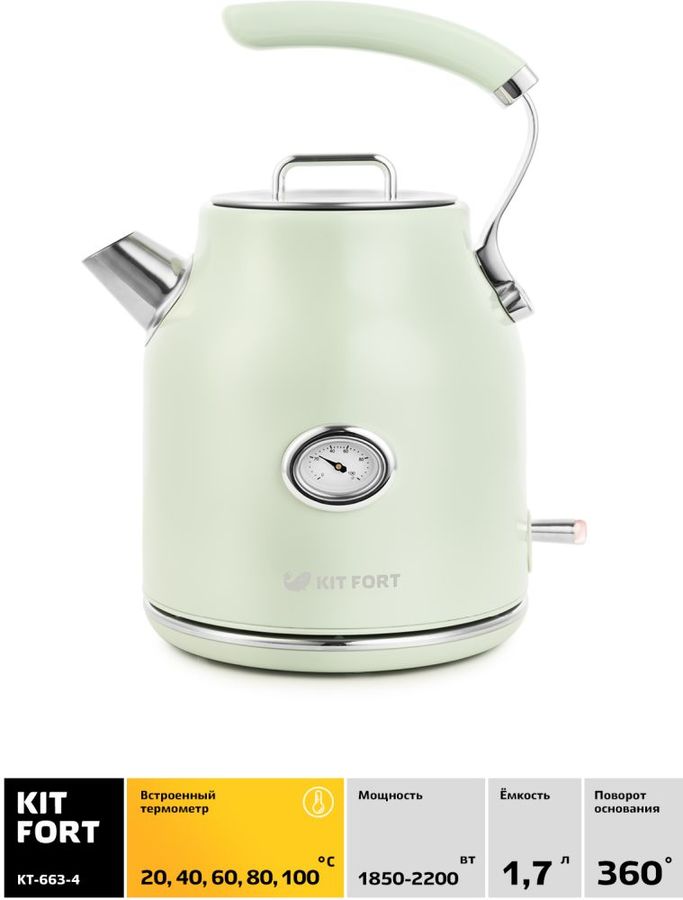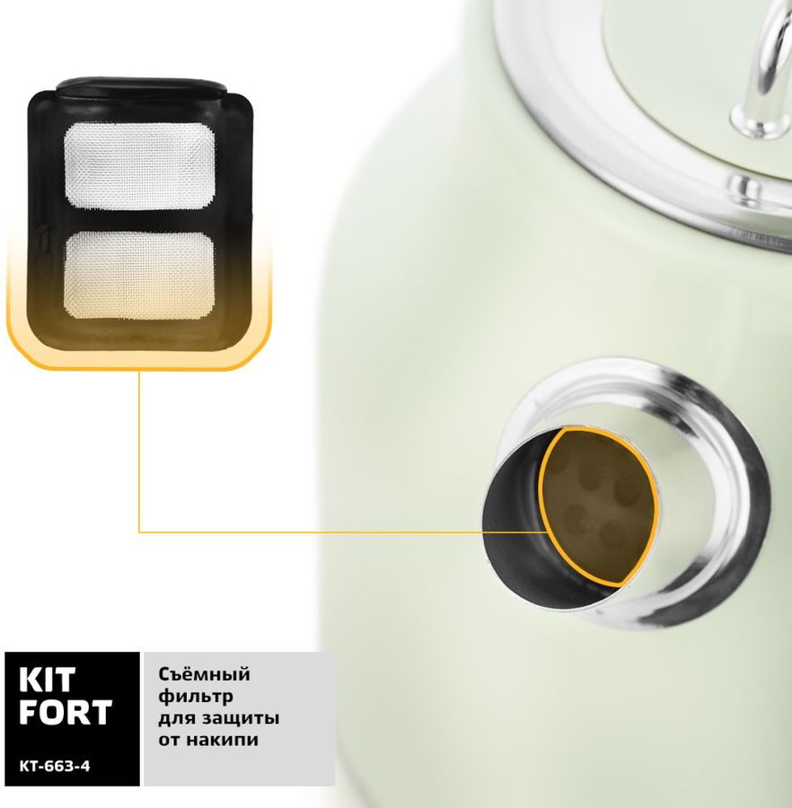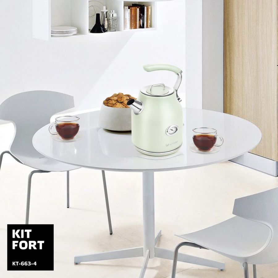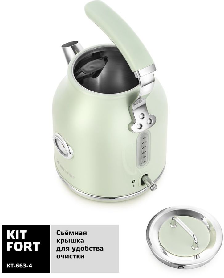 Чайник Kitfort КТ-663-4 1.7л – новое слово в изготовлении кухонных аксессуаров. Он имеет необычную форму, оригинальный стильный дизайн, выполнен из прочной нержавеющей пищевой стали, окрашенной в мятный цвет. Может использоваться в домашних условиях, на даче или в офисе. Металлический корпус не требует сложного ухода и не предусматривает использования химических моющих препаратов. Эргономичная пластиковая ручка выполнена из материала, не подверженного нагреванию и деформации при повышенных температурах.
