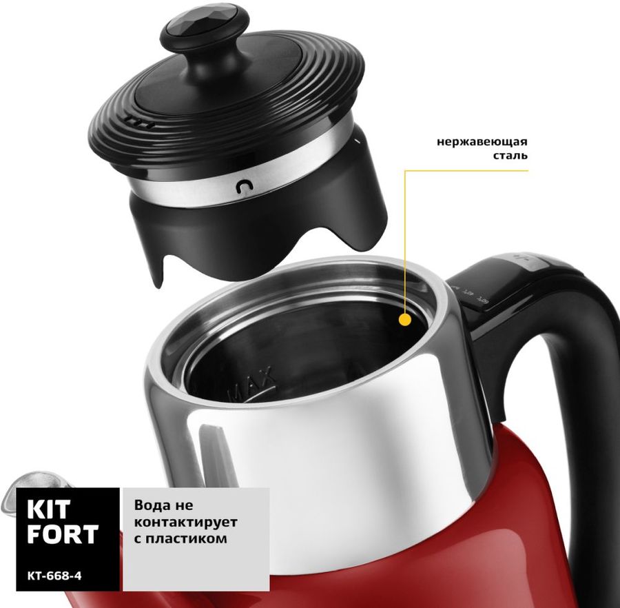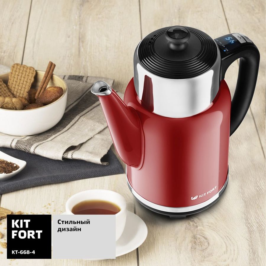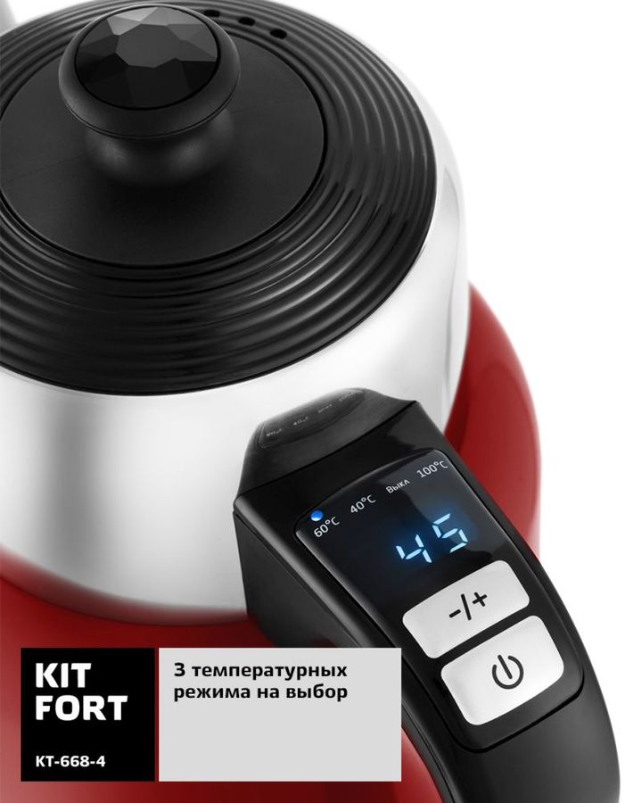 Описание: Электрический чайник Kitfort KT-668 с терморегулятором позволит не только вскипятить воду, но и нагреть ее до температуры от 40 до 100, что очень удобно для заваривания различных сортов чая, кофе или для приготовления детского питания.