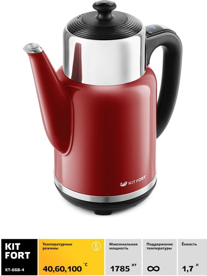 Для комфортного и быстрого приготовления горячих напитков для всей семьи идеально подойдет электрический чайник KITFORT КТ-668-4. Он обладает мощностью 1785 Вт и объемом 1,7 литра. Эта модель позволяет не только кипятить, но и подогревать воду до трех показателей температуры – 40, 60 и 100 градусов. Такую функцию по достоинству оценят любители разнообразных сортов чая, а также мамы, постоянно готовящие детское питание.