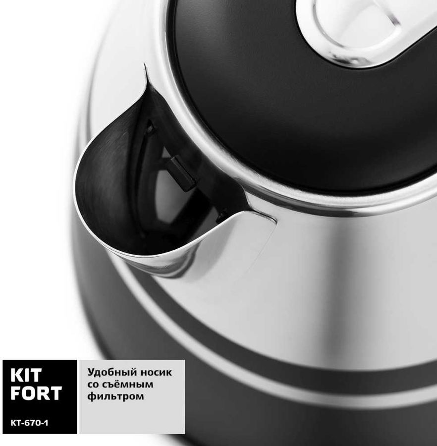 Незначительная мощность в 2200 Вт позволяет использовать электрический чайник KITFORT КТ-670-1 в помещениях со слабой проводкой. Его современный привлекательный корпус имеет мерную шкалу, выключатель под ручкой, кнопку открывания крышки на ручке. Для получения качественной воды прибор наделили хорошим фильтром "антинакипь". Максимальное количество заливаемой воды для кипячения — 1.7 литра.