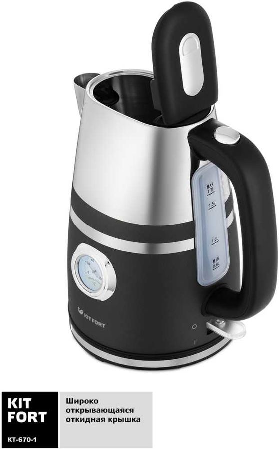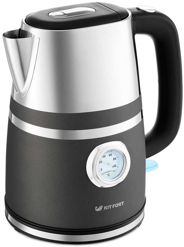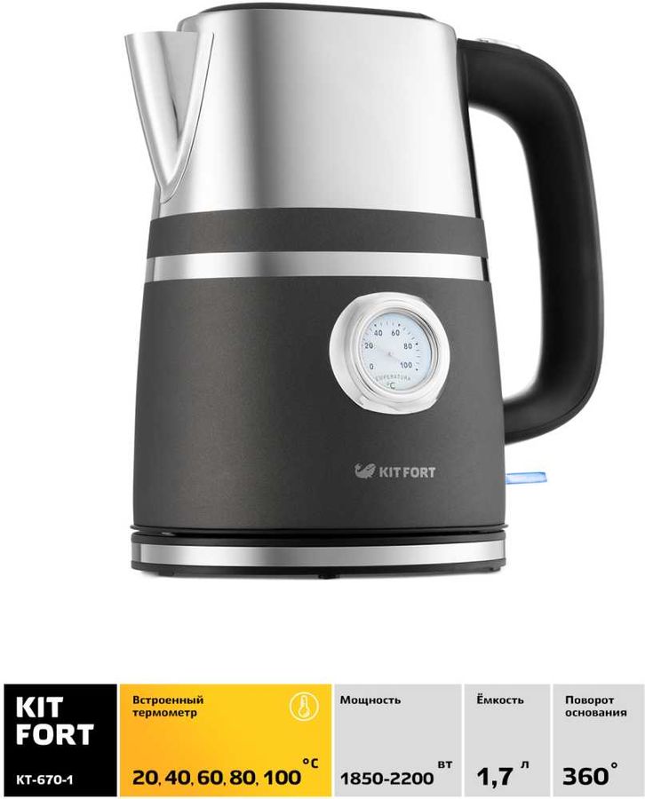 Эргономичная подставка на 360 градусов электрического чайника KITFORT КТ-670-1 позволяет ставить устройство, как удобно пользователю — ручкой в любом направлении. Оборудование для кипячения воды сделано из пластика и металла. Цвет корпуса — графит. На одной из сторон чайника установили винтажный градусник - от 20 градусов до 100 градусов. Изделие изготовлено в Китае.