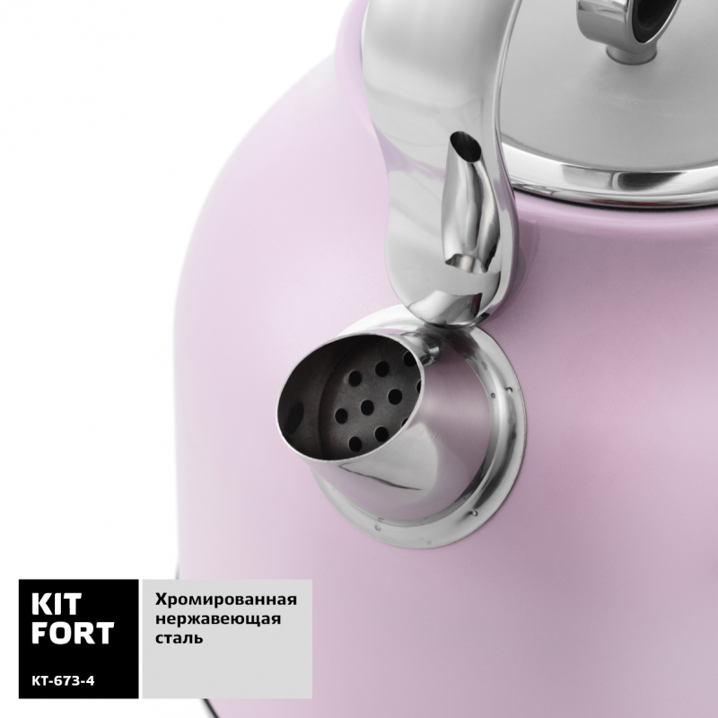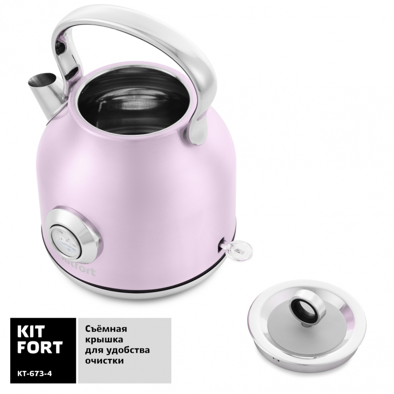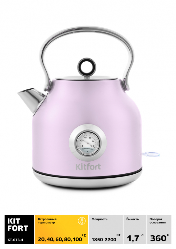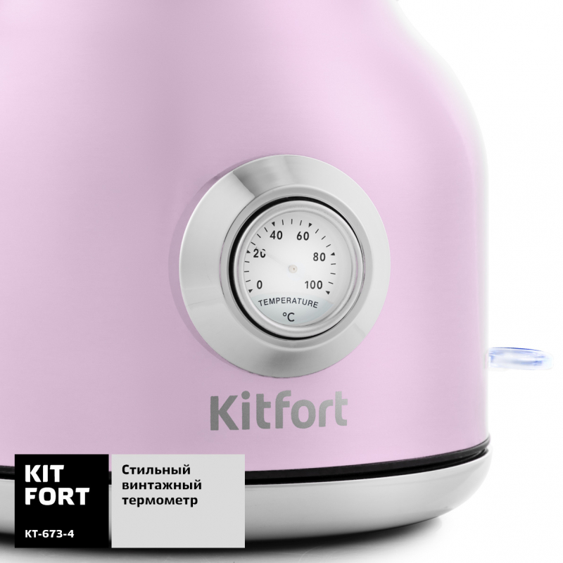 Электрический чайник Kitfort КТ-673-4 предназначен для кипячения воды дома, в офисах и загородных домах. Главная особенность модели – наличие термометра на боковой поверхности корпуса, благодаря которому можно точно оценить температуру воды для приготовления того или иного напитка. Ручка чайника изготовлена из пластика, а корпус – из нержавеющей стали. Ручка не нагревается и удобно лежит в руке. Кнопка включения/выключения расположена на корпусе снизу, на противоположной стороне от носика чайника. Чайник укомплектован крышкой с удобной ручкой. Подставка выполнена из пластика. Нагревательный элемент (ТЭН) у данной модели чайника скрытый и находится в донной части. Сверху он закрыт специальной металлической пластиной из нержавеющей стали, благодаря которой исключается прямой контакт ТЭНа с водой и обеспечивается повышенный срок его службы. Такая конструкция также препятствует образованию накипи, облегчает уход и значительно снижает шум при нагревании воды. Подставка с центральным контактом дает возможность располагать на ней чайник в любом положении, обеспечивая вращение на 360°. Есть отсек для хранения шнура. Чайник автоматически отключается при закипании и при снятии с подставки, имеет защиту от перегрева и от включения без воды.