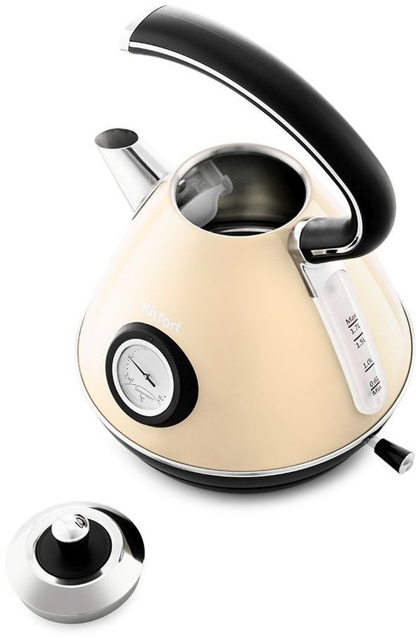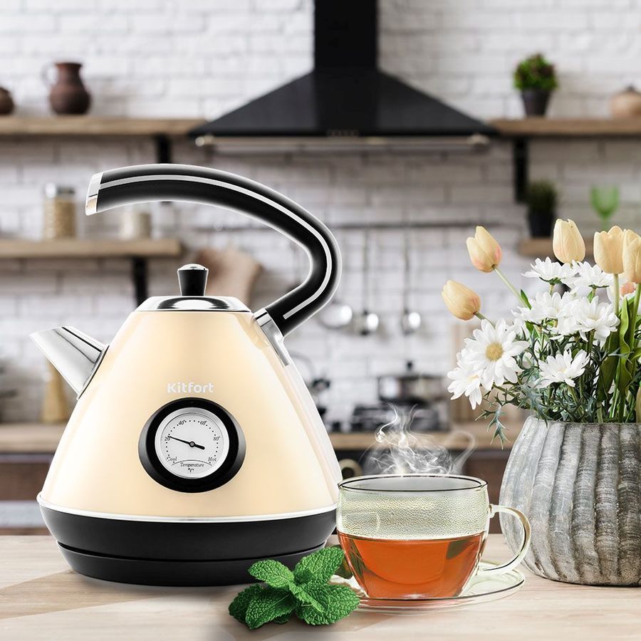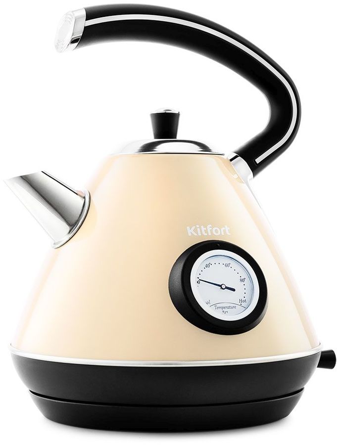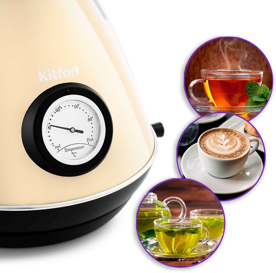 Описание: Чайник Kitfort КТ-686 имеет встроенный термометр, выполненный в винтажном стиле. Это очень удобно для заваривания различных напитков, для которых требуется определённая температура воды. Например, зелёный чай, белый чай, кофе и тд.