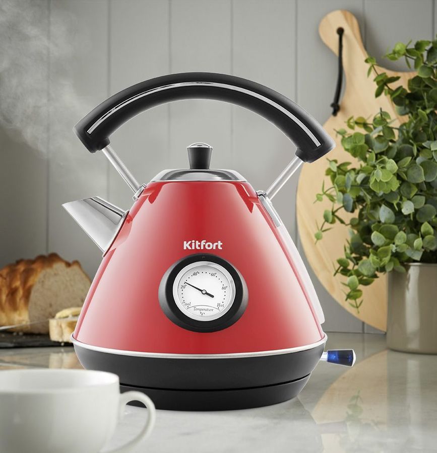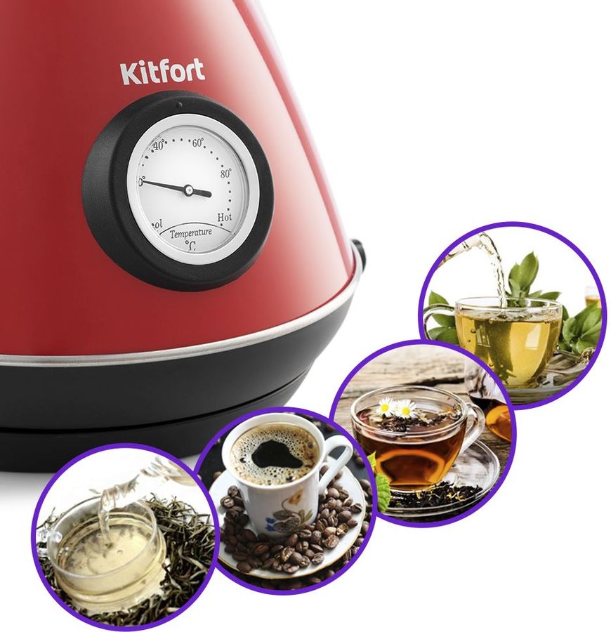Описание: Чайник Kitfort КТ-687 имеет встроенный термометр, выполненный в винтажном стиле. Это очень удобно для заваривания различных напитков, для которых требуется определённая температура воды. Например, зелёный чай, белый чай, кофе и тд.