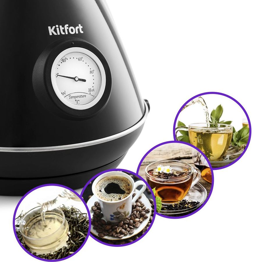 Чайник электрический KITFORT KT-687-2 выключится автоматически, если вода достигла температуры крутого кипятка. А если для вашего любимого напитка она должна быть чуточку холоднее, вы сами сможете отрегулировать температуру благодаря термометру на корпусе прибора. Заваривайте черный и зеленый чай, готовьте кофе по новым рецептам. Вы легко повернете ваш чайник на подставке-пируэте и комфортно удержите за ручку в форме скобки.