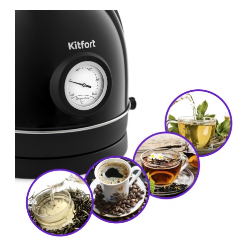 Чайник Kitfort КТ-688 имеет встроенный термометр, выполненный в винтажном стиле. Это очень удобно для заваривания различных напитков, для которых требуется определённая температура воды. Например, зелёный чай, белый чай, кофе и тд.