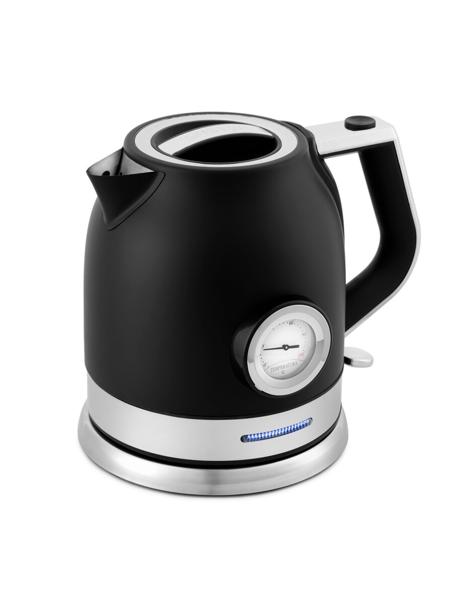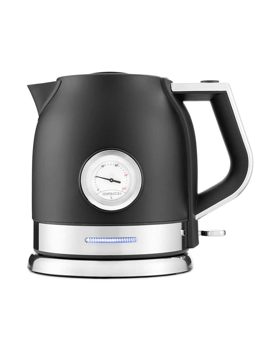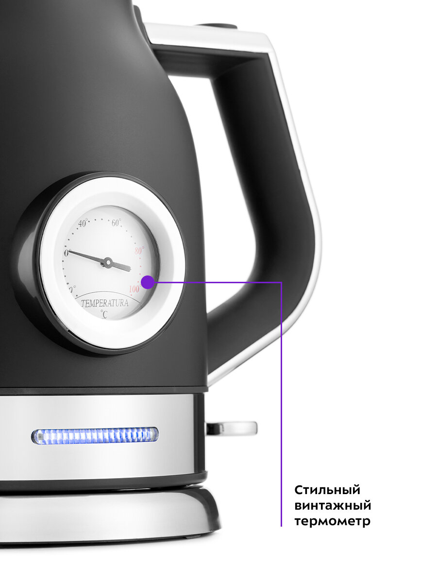 На корпусе чайника расположен термометр, который показывает температуру воды. Это удобно, если вы готовите напитки, для которых требуются определенная температура воды, например, зеленый чай, чёрный чай, кофе и т. д.