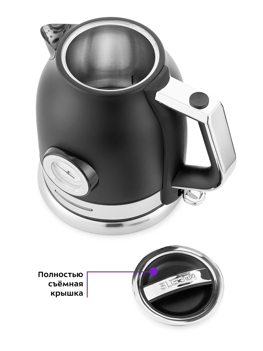 Для максимально лёгкого мытья и удобного заливания воды чайник оснащён целиком съёмной крышкой и широким горлышком.
