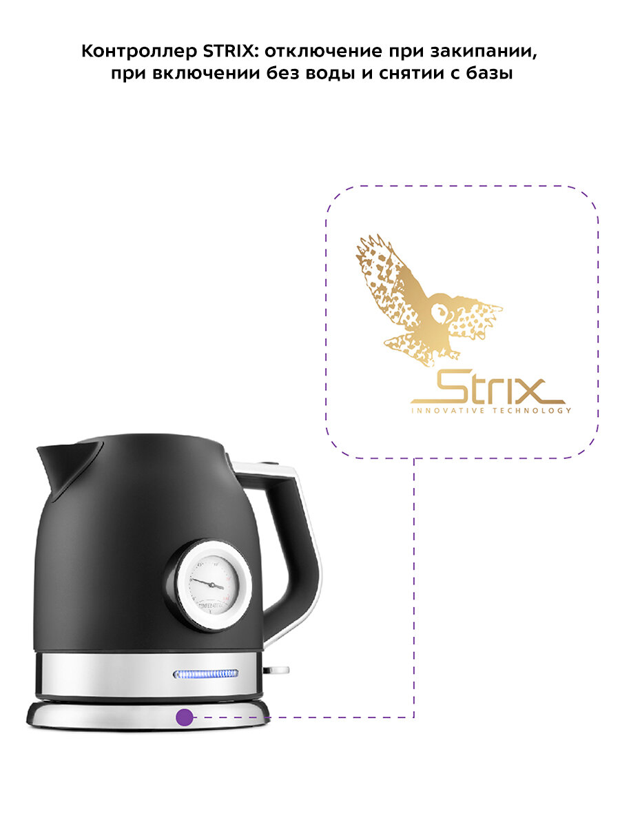 Чайник оснащён контроллером Strix - № 1 среди поставщиков компонентов для электрочайников. Он устраняет риски короткого замыкания и возгорания прибора. Обеспечивает защиту при закипании, при включении чайника без воды.