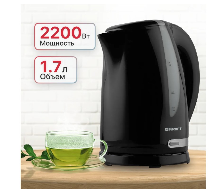 Стеклянный электрический чайник KRAFT KF-KP1743BL выполнен в чёрном цвете, имеет мощность 2200 Вт и способен за несколько минут довести до кипения 1,7 л. воды. Особенностью модели является наличие нейлонового фильтра в носике.