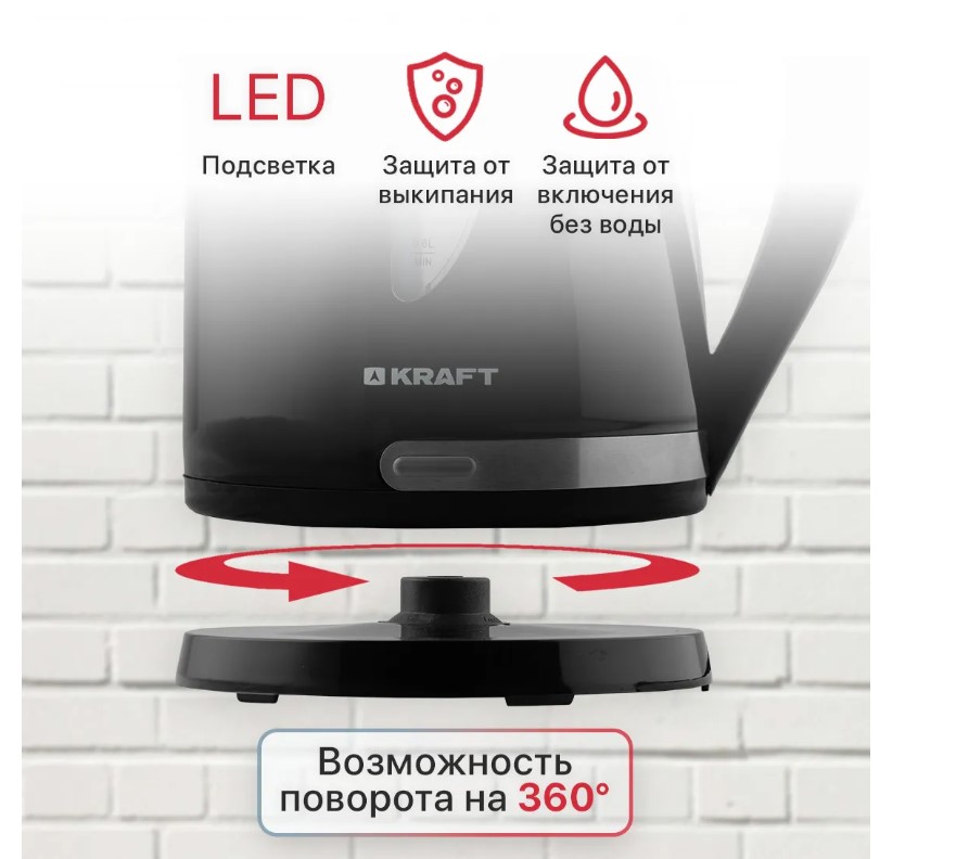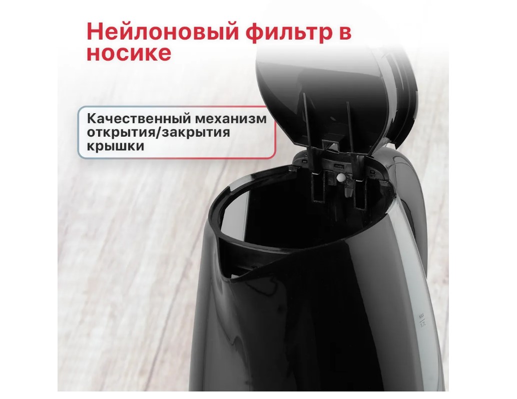 Корпус электро чайника изготовлен из термостойкого стекла. Модель оснащена имеет LED подсветкой, автоматическим отключением и защитой от от включения без воды. В электрическом чайнике также предусмотрен качественный механизмом открытия и закрытия крышки.Все пластиковые элементы в электрическом чайнике сделаны из пищевого пластика первичной обработки. Это значит, что в пластике нет вредных примесей, он может безопасно контактировать с водой и продуктами.