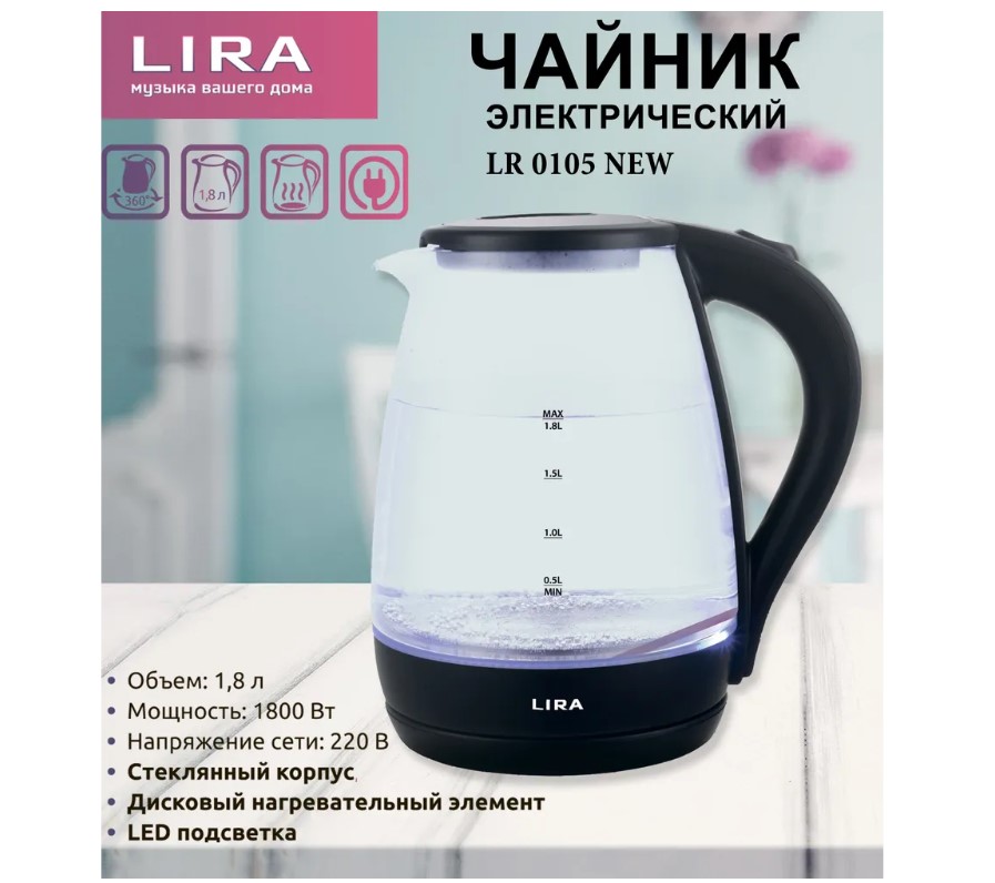 Домашний электрический стеклянный чайник LIRA изготовлен из экологически чистых материалов, химически нейтральны и не имеют запаха. Вращающийся корпус на 360 градусов. У модели чайника электрического стеклянный корпус и светло-голубая LED-подсветка, которая служит индикатором кипения, визуально украшает прибор и делает кухню ещё уютнее.