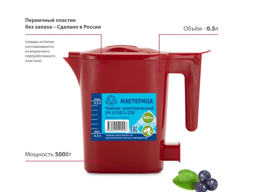 Электрический чайник Мастерица ЭЧ 0,5/0,5-220 изготовлен из пищевого пластика и не опасен для здоровья. Выполнено устройство в оригинальном красном цвете, который сразу же привлечет внимание к себе. Нагревательный элемент - ТЭН, спираль из нержавеющей стали. Если вам нужно небольшое количество горячей воды, то этот чайник именно то, что вам нужно.