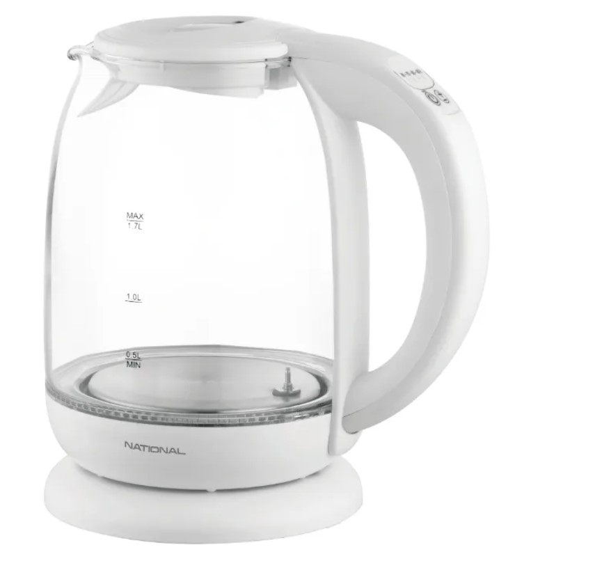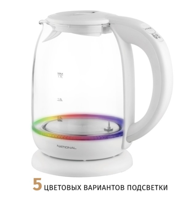 Умный стеклянный чайник с регулировкой температуры и режимом поддержания тепла японского бренда NATIONAL имеет электронное управление на ручке со световой индикацией выбора температуры.