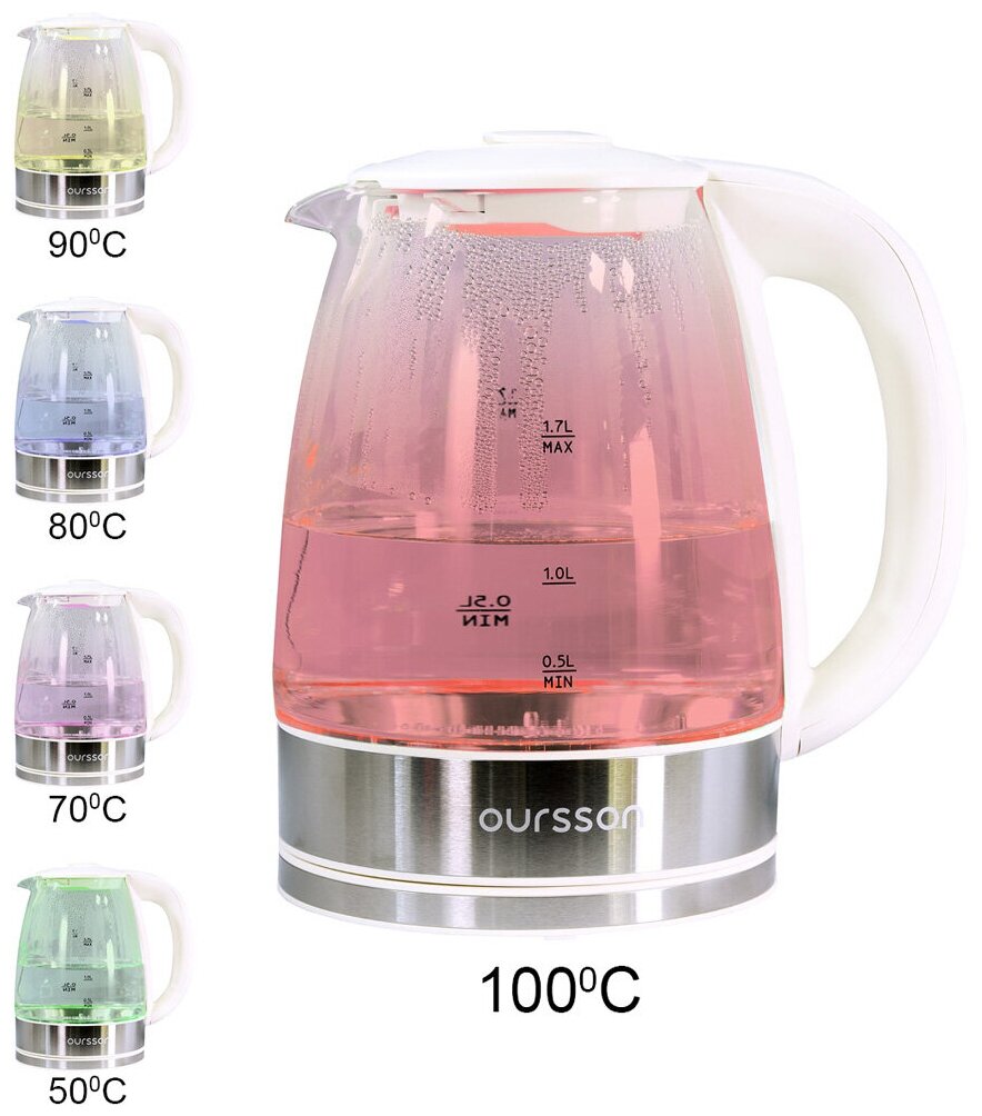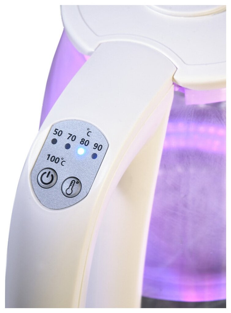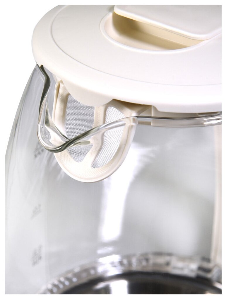 Конструкция чайника: Вращение подставки на 360°, Изменение цвета корпуса при закипании, Индикатор уровня воды, Отсек для шнура, Светоиндикатор работы, Фильтр от накипи