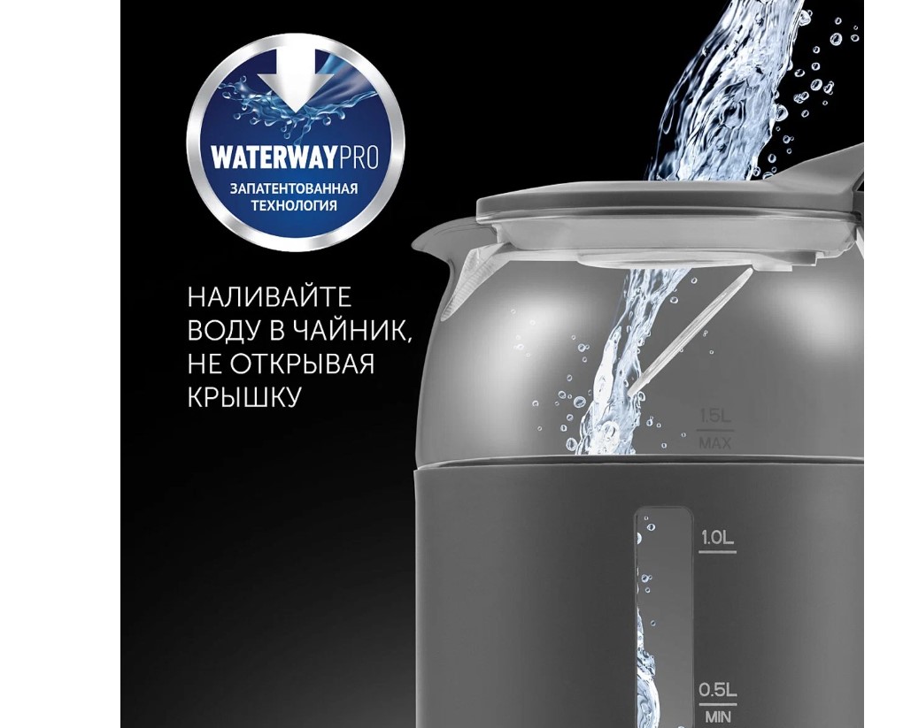 Есть двусторонняя шкала, технология верхнего залива Waterway PRO, вращающийся корпус на 360°, автоотключение при отсутствии воды, автоотключение при закипании, индикатор работы, подсветка, длина шнура 0,8 м
