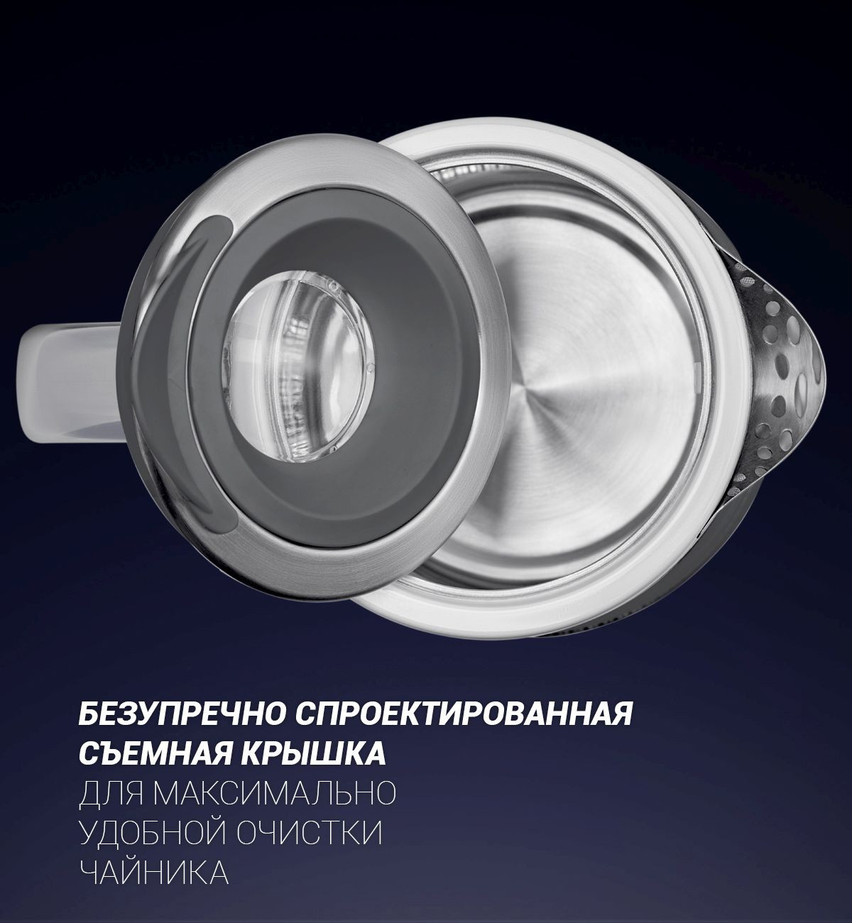 Особенности: Безупречно спроектированная съемная крышка для максимально удобной очистки чайника. Английский контроллер Strix обеспечивает 15 000 циклов кипячения, что равно 10 годам интенсивного использования. Корпус из высококачественного термостойкого стекла.