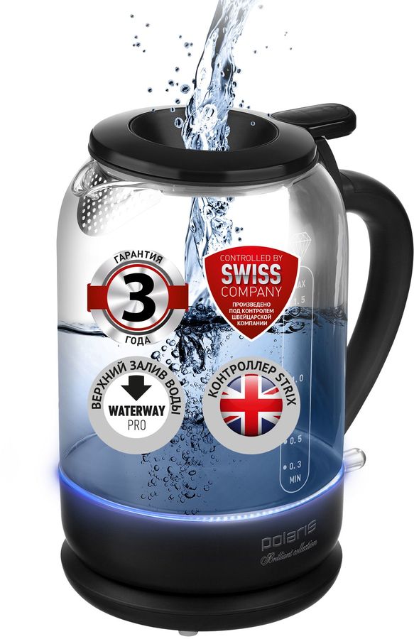 Запатентованная технология "WATERWAY PRO" – удобный залив воды без открытия крышки. Инновационная сталь на дне чайника. Максимально легкая очистка. Английский контроллер STRIX: 15 000 циклов кипячения, что равно 10 годам интенсивного использования.
