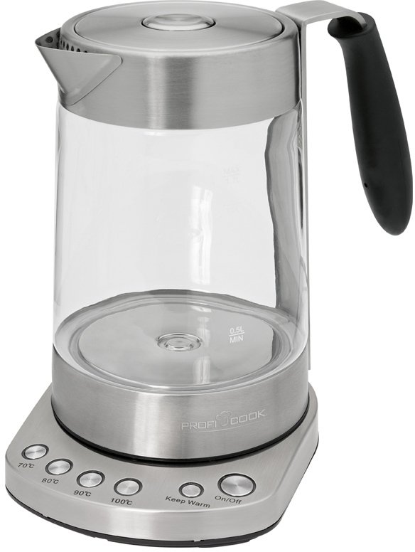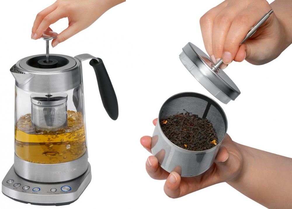 объем 1.7 л, мощность 3000 Вт, закрытая спираль, установка на подставку в любом положении, стальной фильтр для заварки в комплекте, корпус из стали и стекла, выбор температуры нагрева воды