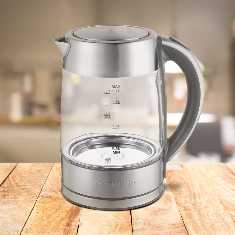 объем 1.7 л, мощность 2200 Вт, индикация включения, закрытая спираль, установка на подставку в любом положении, корпус из стали и стекла, подсветка корпуса, вес 1 кг